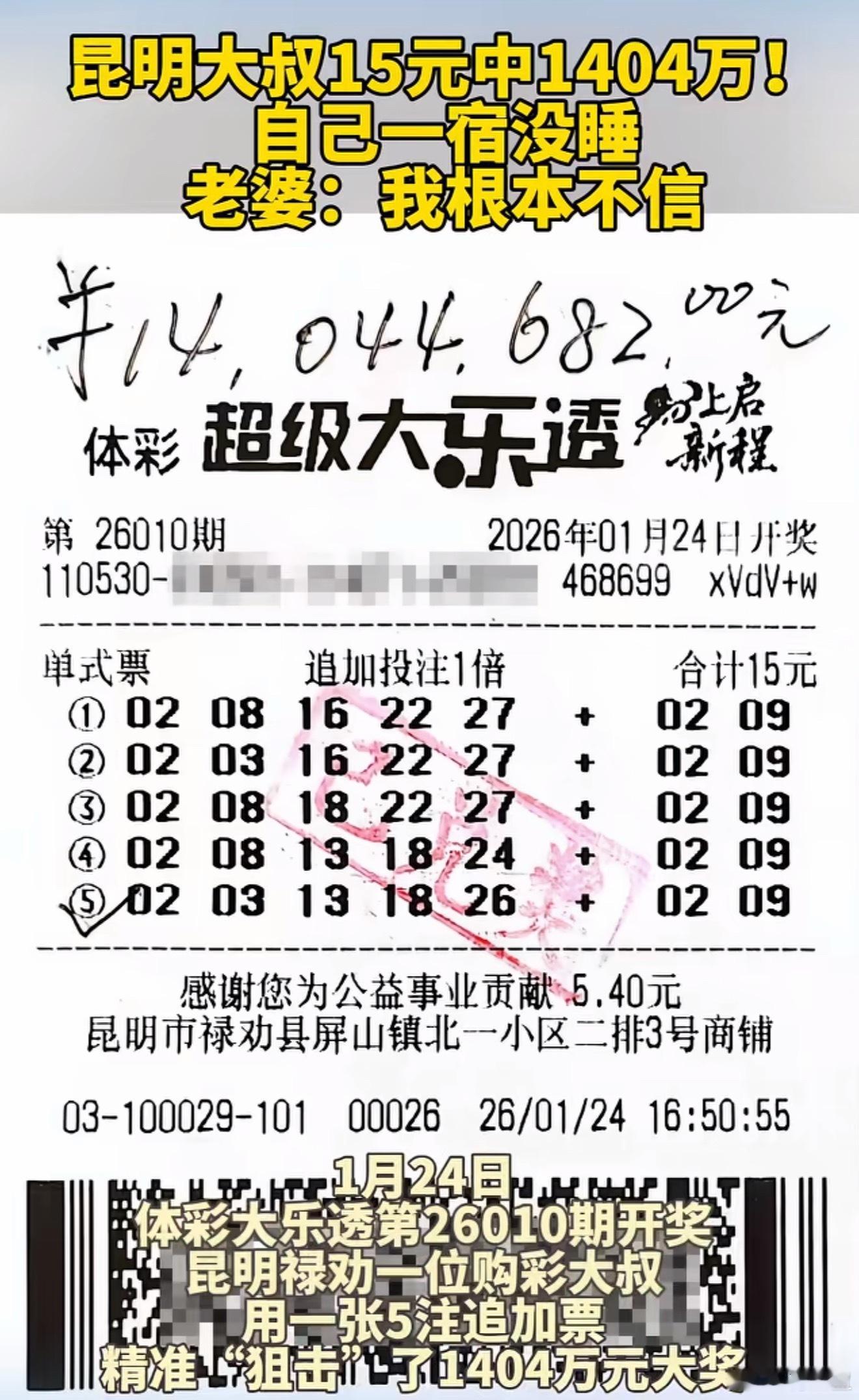 男子买15元彩票中1404万15元投注竟斩获1404万大奖!这运气也太逆天了吧!大叔激动到彻夜未眠,反复核对中奖号码,就连妻子起初都不敢相信,这一幕简直真实到戳心~