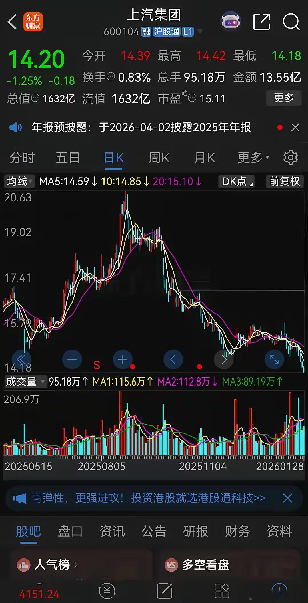 上汽集团跌得太惨了!公司股价从去年八月份开始就一路单边下跌,不断见新低,越跌越狠。最近更是6连阴,今天盘中再创新低,最低跌到了14.18元,较去年八月份已经下跌了31%。上汽集团在1月15日就发布了2025年业绩报告,归母净利润90亿元至110亿元,同比增长438%至558%。股民们本以为业绩大增,股价会强劲反弹,结果却等来的是连续崩盘式下跌。明明业绩大幅增长,股价却跌得像破产了似的,到底问题出在哪里?