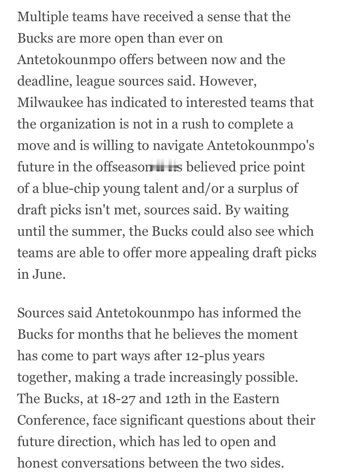 Shams:消息人士透露,过去数月里,字母哥已经告知雄鹿,在双方共事超过12年之后,他认为是时候分道扬镳,这也让交易的可能性持续升高。雄鹿当前战绩18胜27负,位列东部第12位,球队未来方向面临巨大疑问,这也促使双方展开了坦诚公开的沟通。消息人士称,多支球队都感受到,在当前至交易截止日这段时间里,雄鹿对字母哥的报价持前所未有的开放态度。不过雄鹿也向有意向的球队明确:球队并不急于完成交易,如果没能得到心目中的要价——即一名顶级年轻核心、或是大量选秀权,球队愿意等到休赛期再处理字母哥的未来。等到夏天,雄鹿还能观察哪些球队能在6月提供更具吸引力的选秀签位。