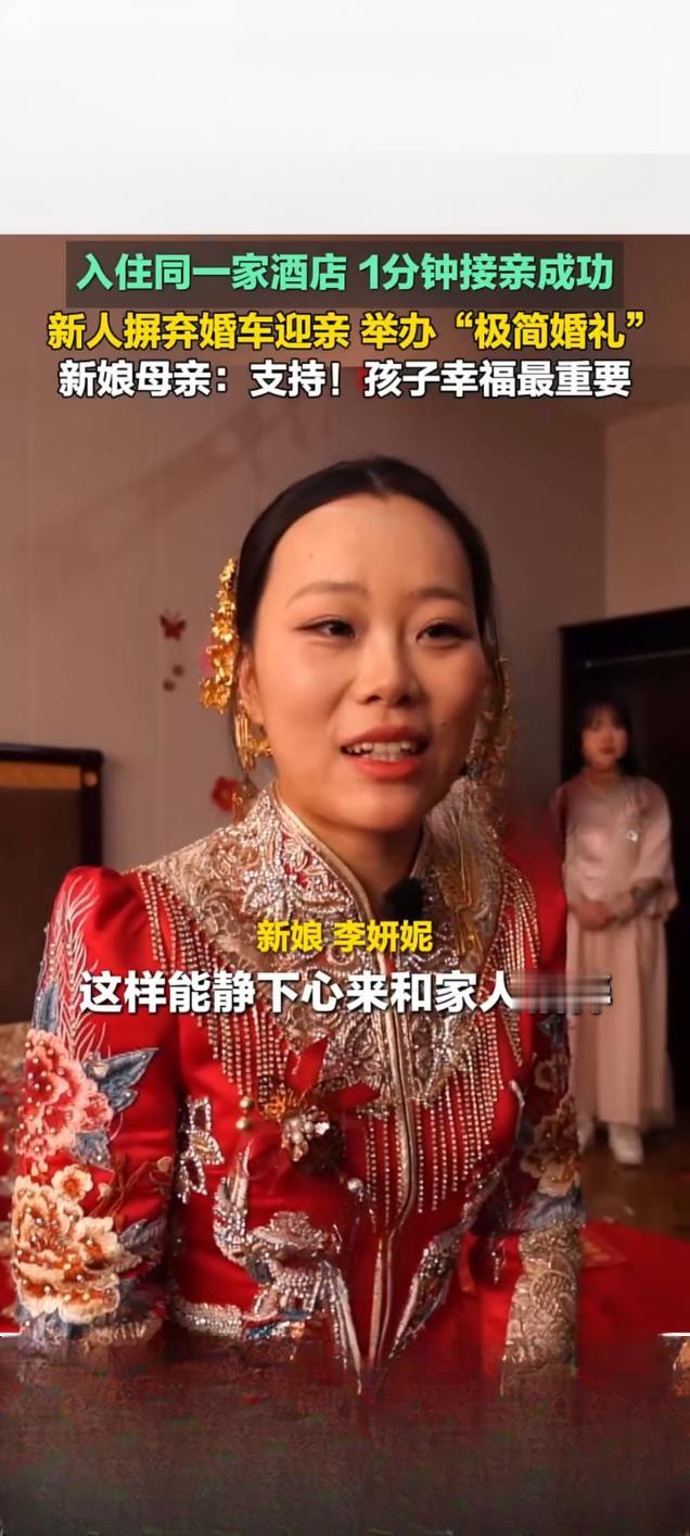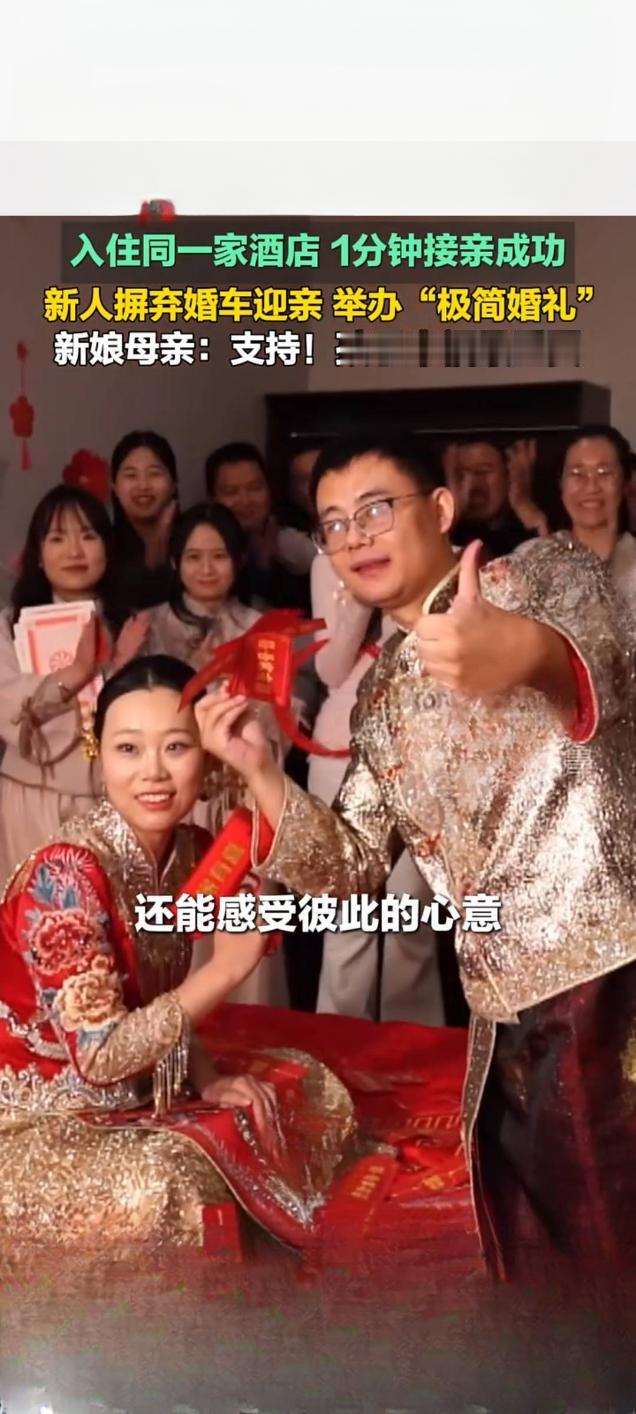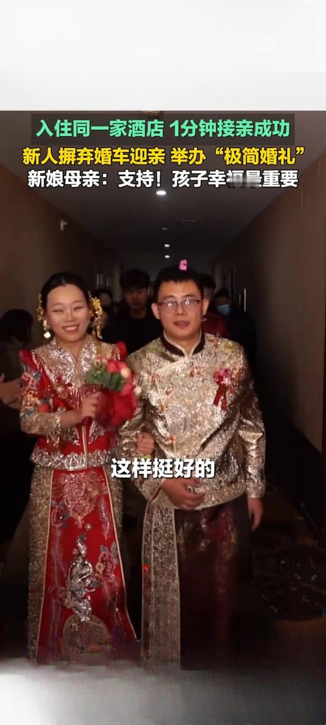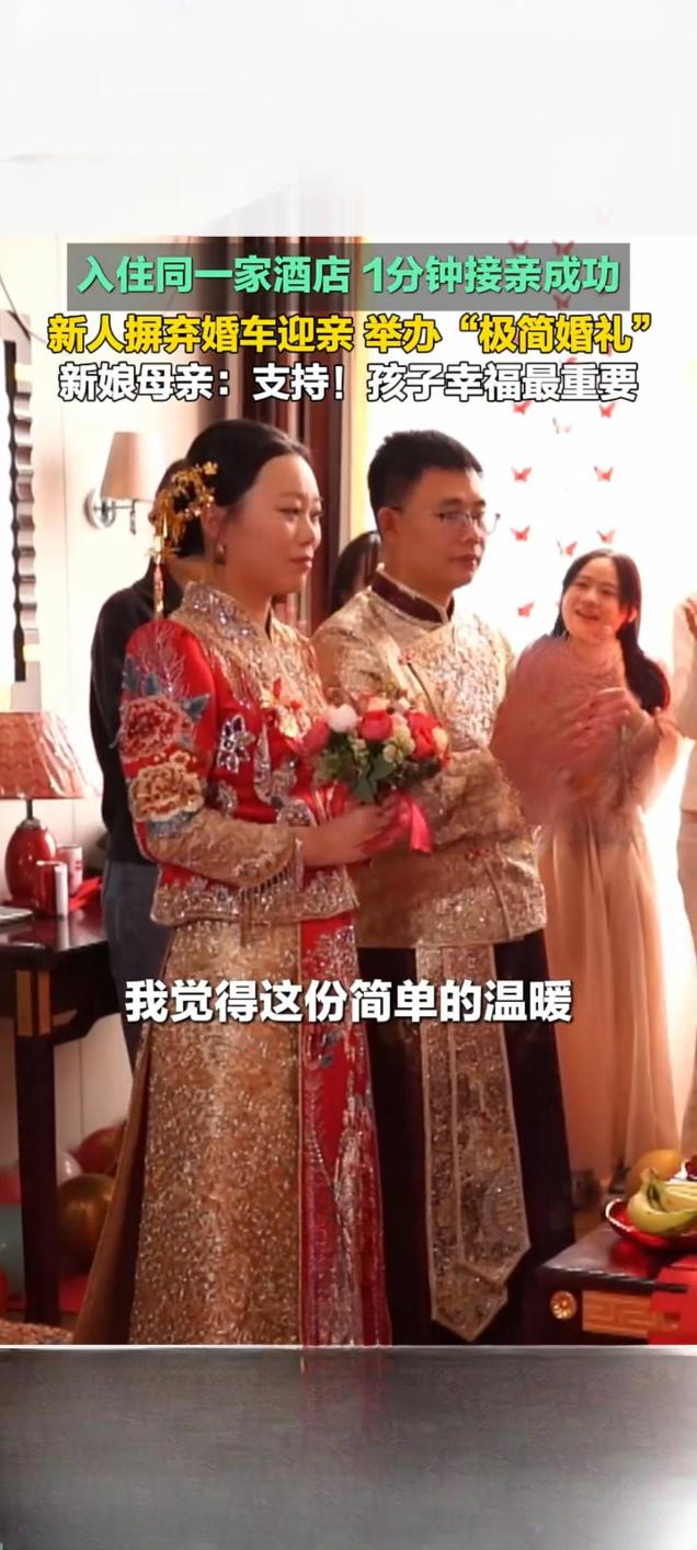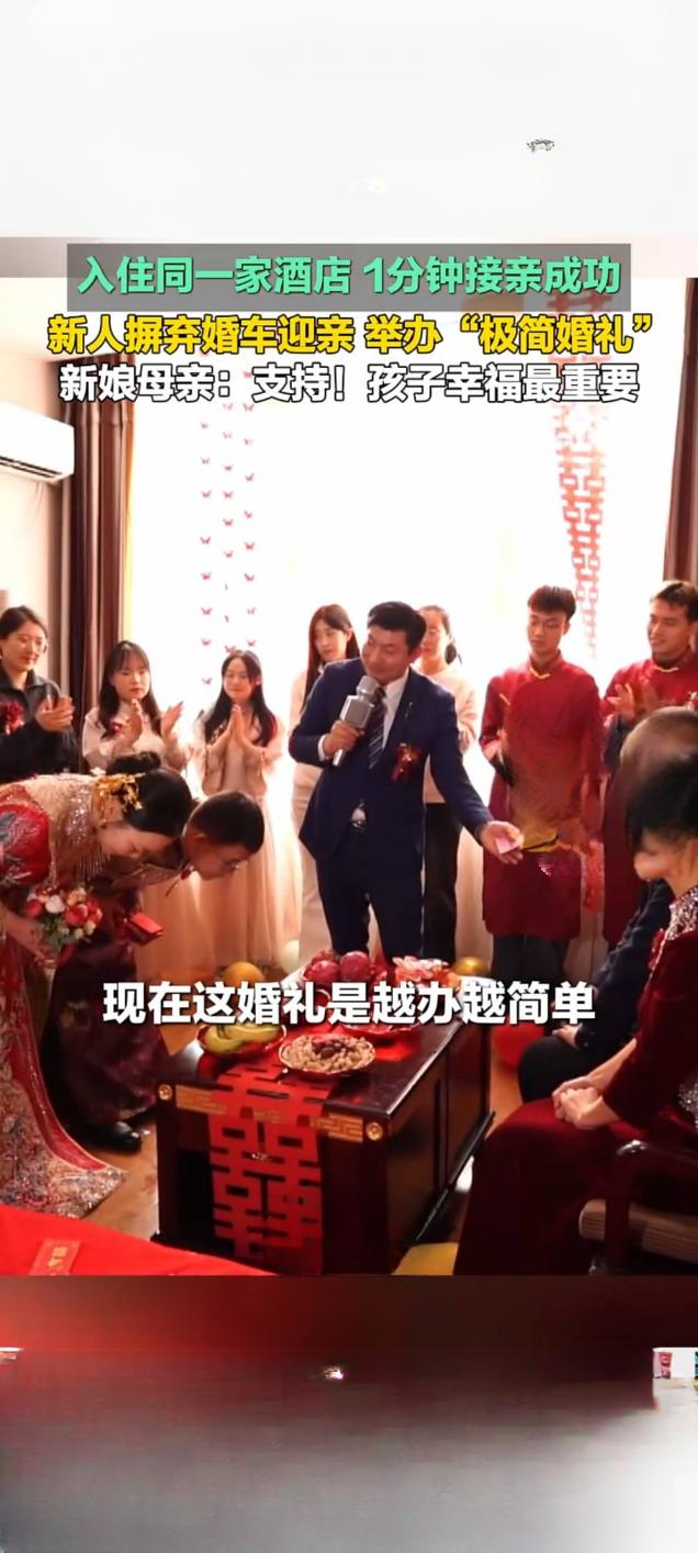 潍坊青州新人办“极简婚礼”:同酒店1分钟接亲,摒弃婚车获赞 1月26日,山东潍坊青州市一对新人举办的“极简婚礼”引发关注,相关视频在快手平台播放量达5352次。这对新人因入住同一家酒店,省去传统跨城接亲环节,仅用1分钟便完成接亲流程,且摒弃婚车迎亲,以简约形式传递幸福。 新娘母亲在采访中表示,全力支持新人的选择,“孩子幸福最重要”,朴实话语道出对新式婚俗的认可。这场婚礼虽简约,却不失温馨,亲友们全程见证新人幸福瞬间,现场氛围热烈。 事实上,青州近年积极倡导婚事新办、简办,此前已有新人用公交车作婚车,如今“1分钟极简接亲”再添文明婚俗新案例。从公交车婚车到同酒店短距离接亲,青州新人不断以务实创新方式,打破传统婚礼繁琐流程与铺张浪费,展现新时代青年崇尚文明、注重家庭经营的精神风貌,也为当地移风易俗注入鲜活力量。无仪式感婚礼 婚礼别具一格