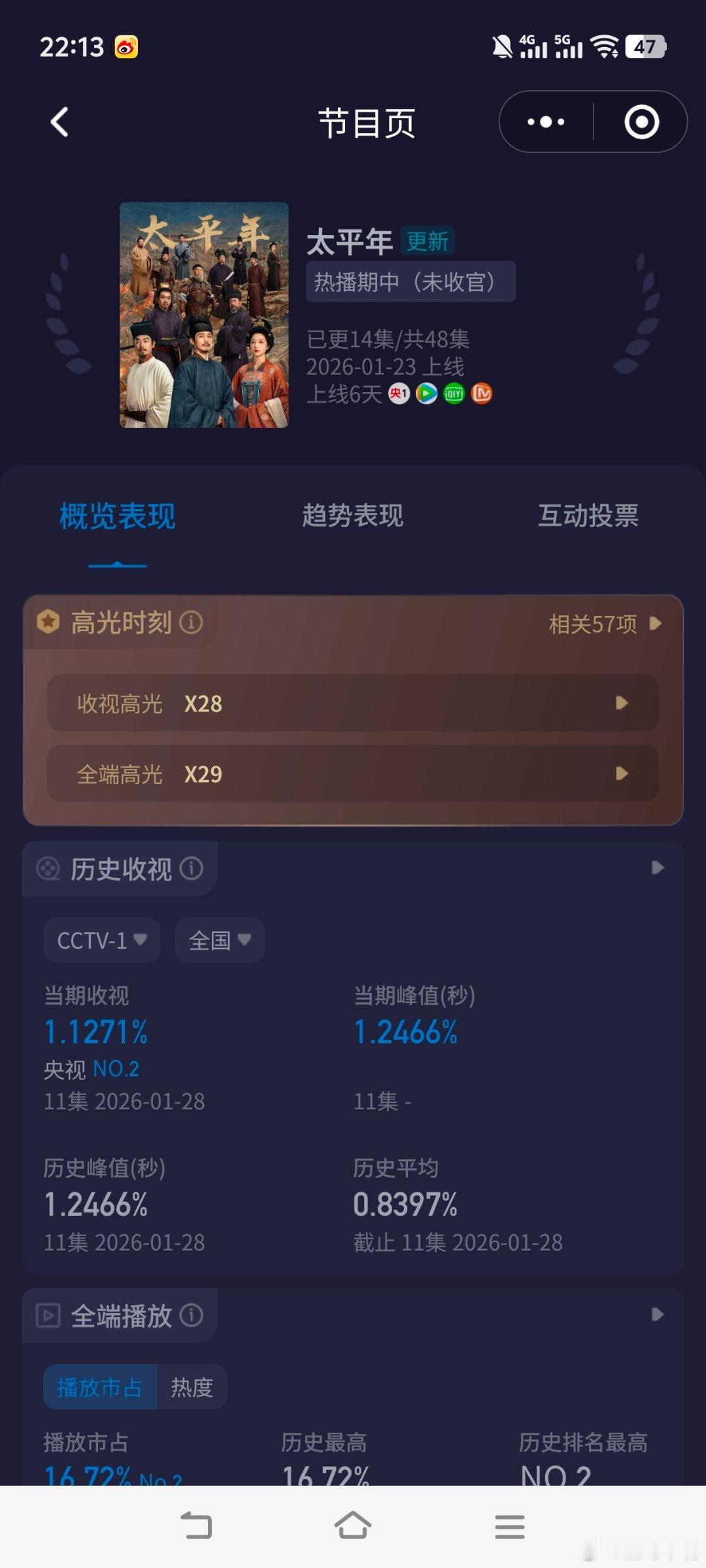 钱弘俶鞭抽贪官孙太真脚踹污吏《太平年》收视率终于涨了!今晚峰值1.2466,平均1.1271,开播以来双数据新高!!今天晚上开始正常排播了,20:00-22:00两集连播,峰值必破2了!22:30一集也会新高。