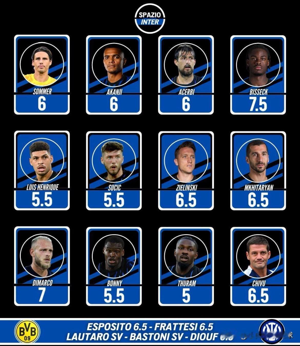 有遗憾、有惊喜!国米空间:欧冠蓝黑军团2比0多特蒙德,赛后评分! 能进能退、能左能右、全面覆盖“战神表现”的比塞克,首发出场并打满:送出63次精准传球,全场第一;完成6次解围、4次争顶,全场第一;得到最高的7.5分。 任意球直接破门的“蓝黑太子”迪马尔科,得到7分,当选本场最佳球员;替补登场,上演一条龙、打进欧冠处子球的迪乌夫,得到6.5分。 其余大部分球员,和主教练齐沃的临场指挥,表现都中规中矩,均在及格线附近。 只有“图图”有点糊涂,首发出场将近90分钟:0射门0射正、11次丢失球权、两次传中尝试均失败;如果没记错的话,本赛季截止目前的11粒进球,仅有一球是面对强队时打进的(联赛对阵尤文图斯)……,真该好好调整调整了!