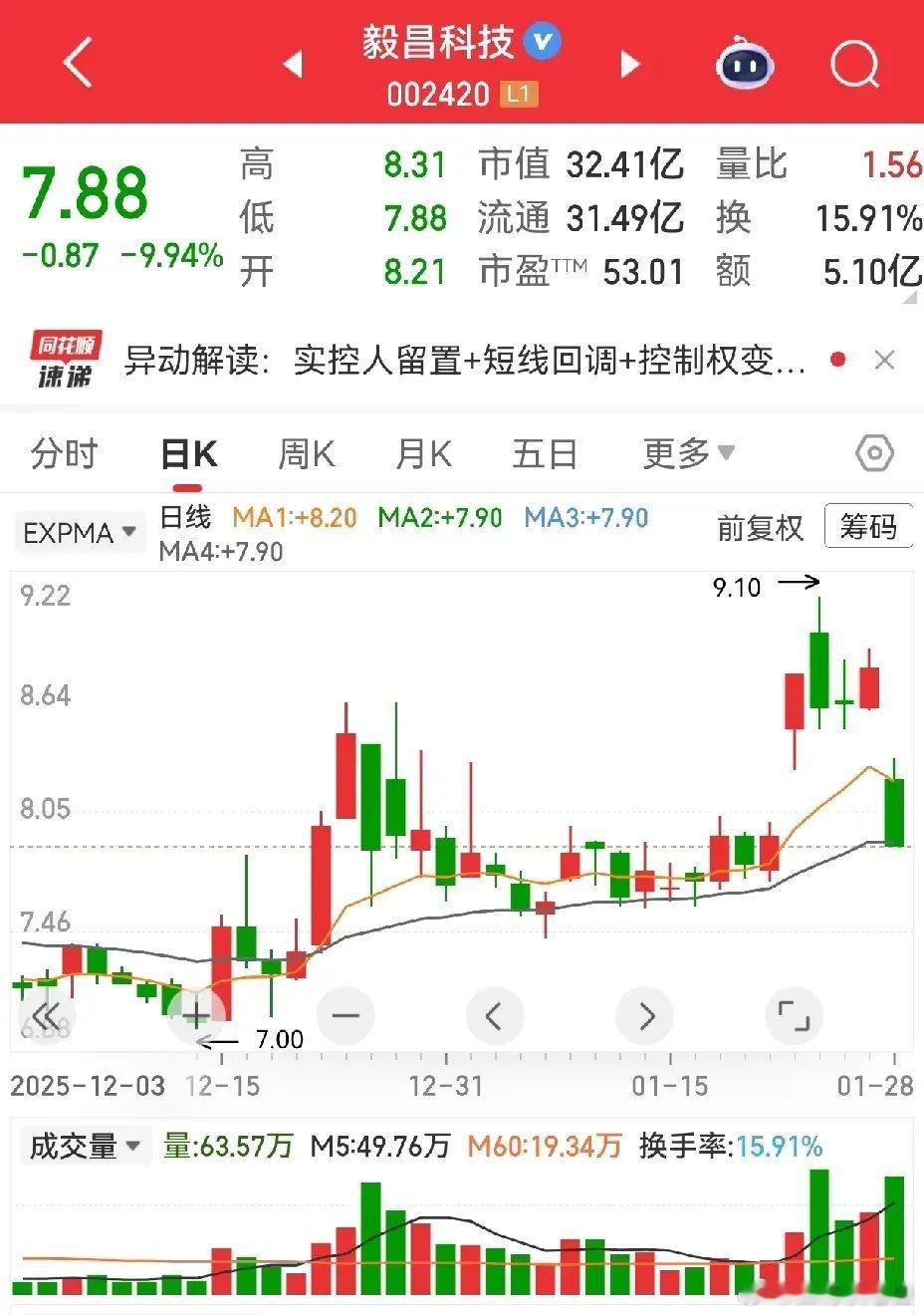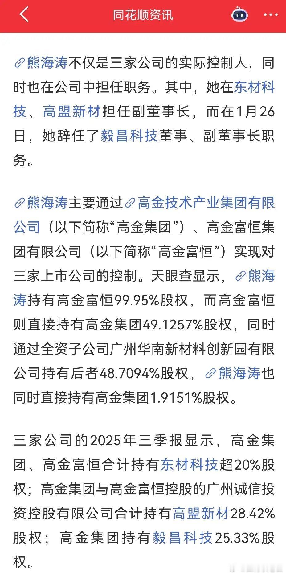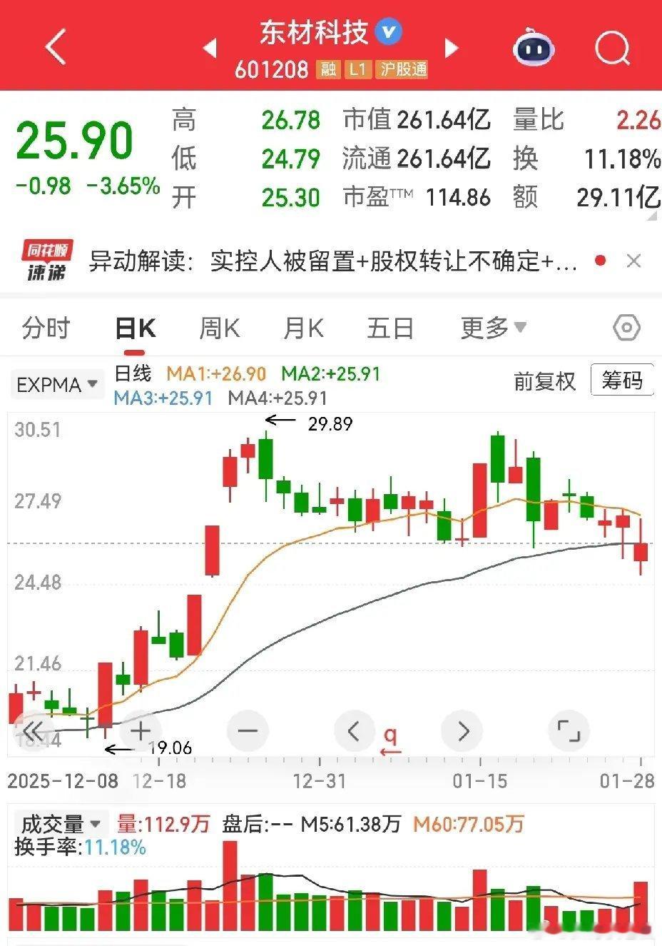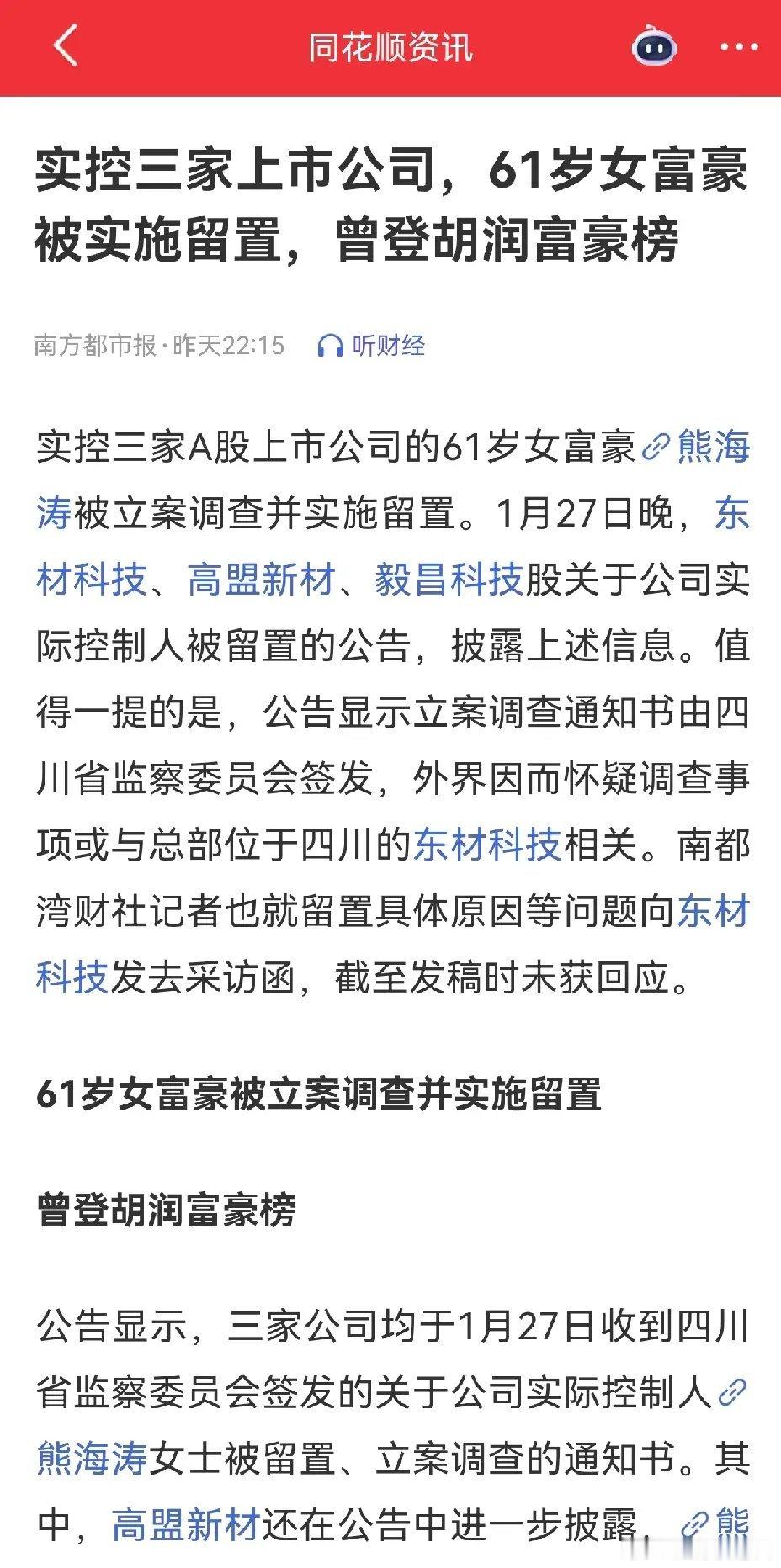 实控三家上市公司的女富豪被留置,相关股票皆遭殃。前两天看这个毅昌科技走得好好的,因控制权有变更预期,再加上预报25年净利润增长58%—138%,有了一个涨停板,后横盘。但是再好的业绩也抵不住实控人被留置这一消息,如果公司经营真的不受影响,控制权真的会变更,业绩真的是增长,那么这次的下跌就是非理性的。看东材科技也有股权转让事宜,也许实控人已经真是在处理转让手中股权,只是时间紧了,没完全处理好,已经被留置了。特别提醒:贴图欣赏,并非推荐,据此操作,风险自担。✦✦✦本人仅此一号,不主动加人,主动加人者是骗子。请提高警惕,否则损失自负。✦✦✦