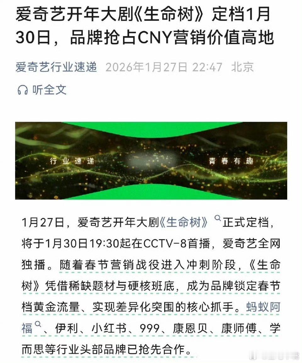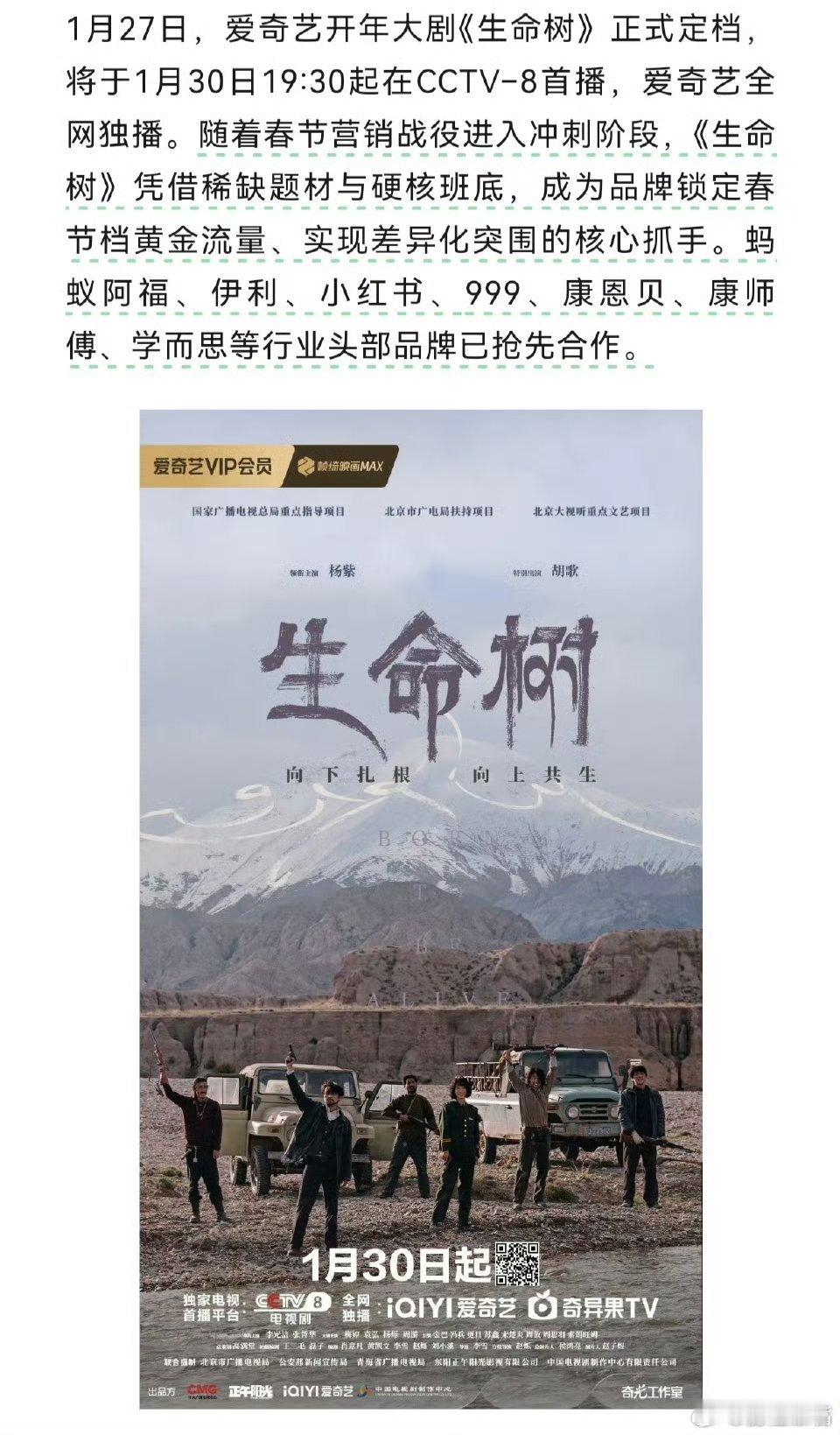 生命树央视版预告片央视版预告看过了,来看品牌预告吧:多家品牌已合作品牌发布文案很谨慎,从不提前开香槟说“年度剧王”!坚守 守护 奔赴前路!杨紫生命树招商好牛