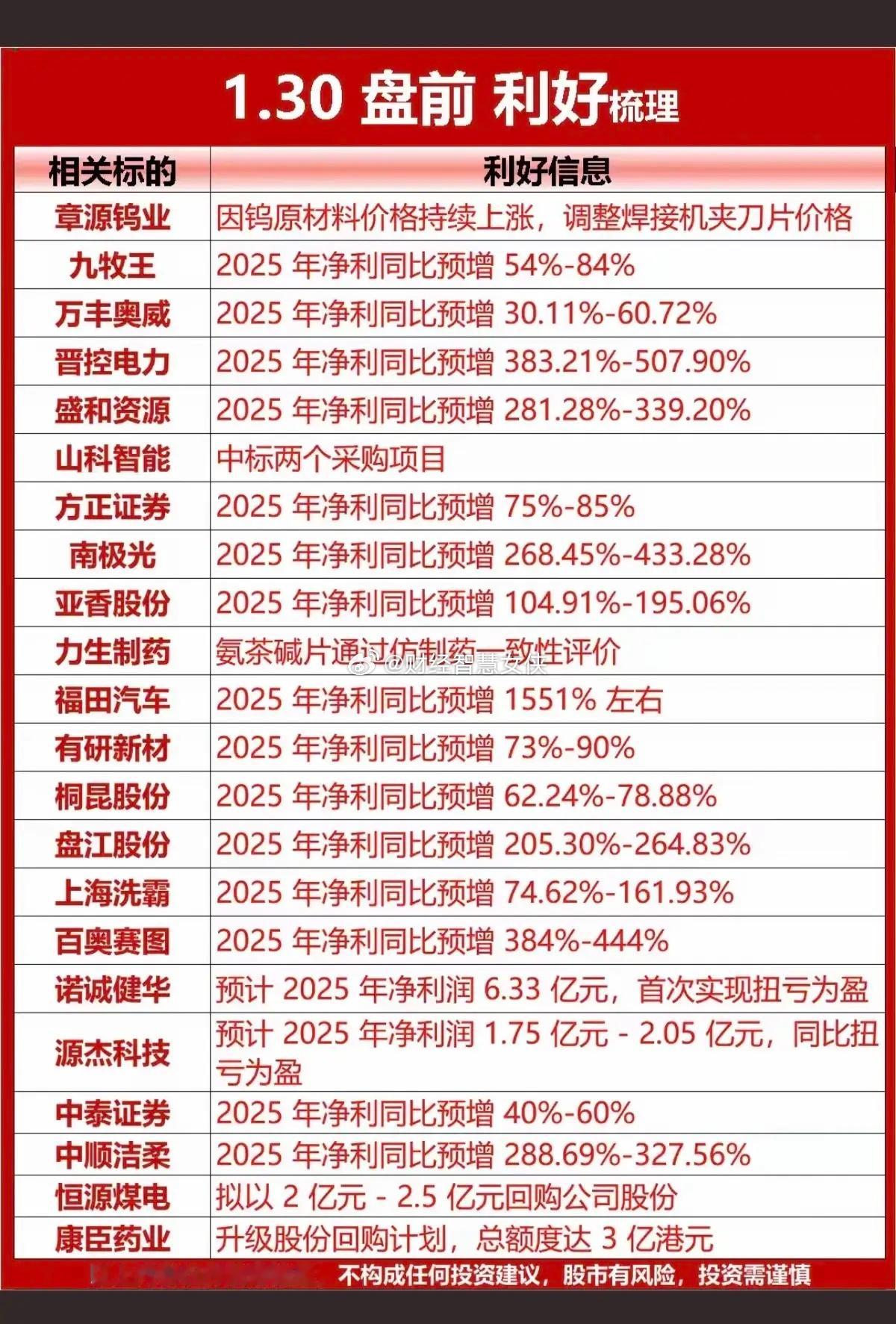 1.30周五 盘前 个股利好公告汇总!主要涉及:涨价、回购股份、中标大项目、高新技术认证、新项目立项、业务增长等股票