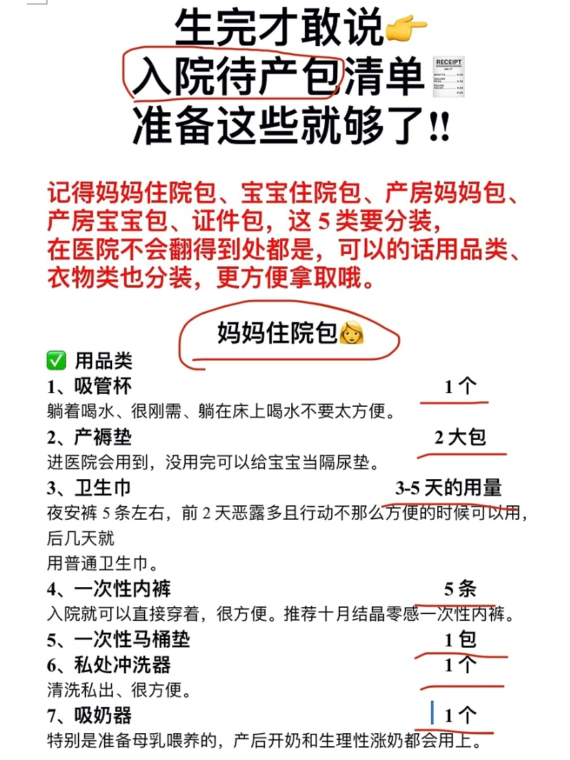 产后1年多,整理了精简入院待产包清单,包括妈妈住院包、宝宝住院包、妈妈产房包、宝宝产房包、证件包,可以直接👀图,这5类要记得分装,在医院就不会翻得到处都是,可以的话用品类、衣物类也分装,更方便拿取哦。