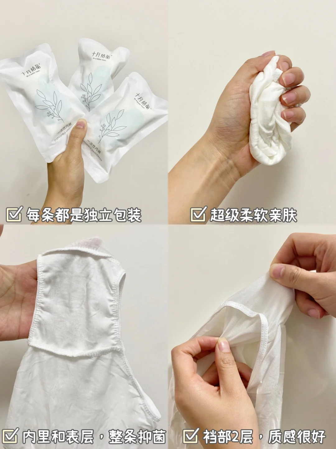 入院待产和月子里恶露期都可以用到,不用洗内内,用完直接扔掉。我用的十月结晶零感一次性内裤,腰部和腿部都有弹力,穿着完全没有束缚。面料是100%木源植物纤维的,超级柔软透气,不会闷闷的,恶露很少的时候我会直接穿这个一次性内裤,比随时带着卫生巾透气多了。AAA级抑菌,可以减少yin道炎症的发生。