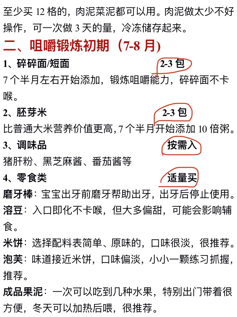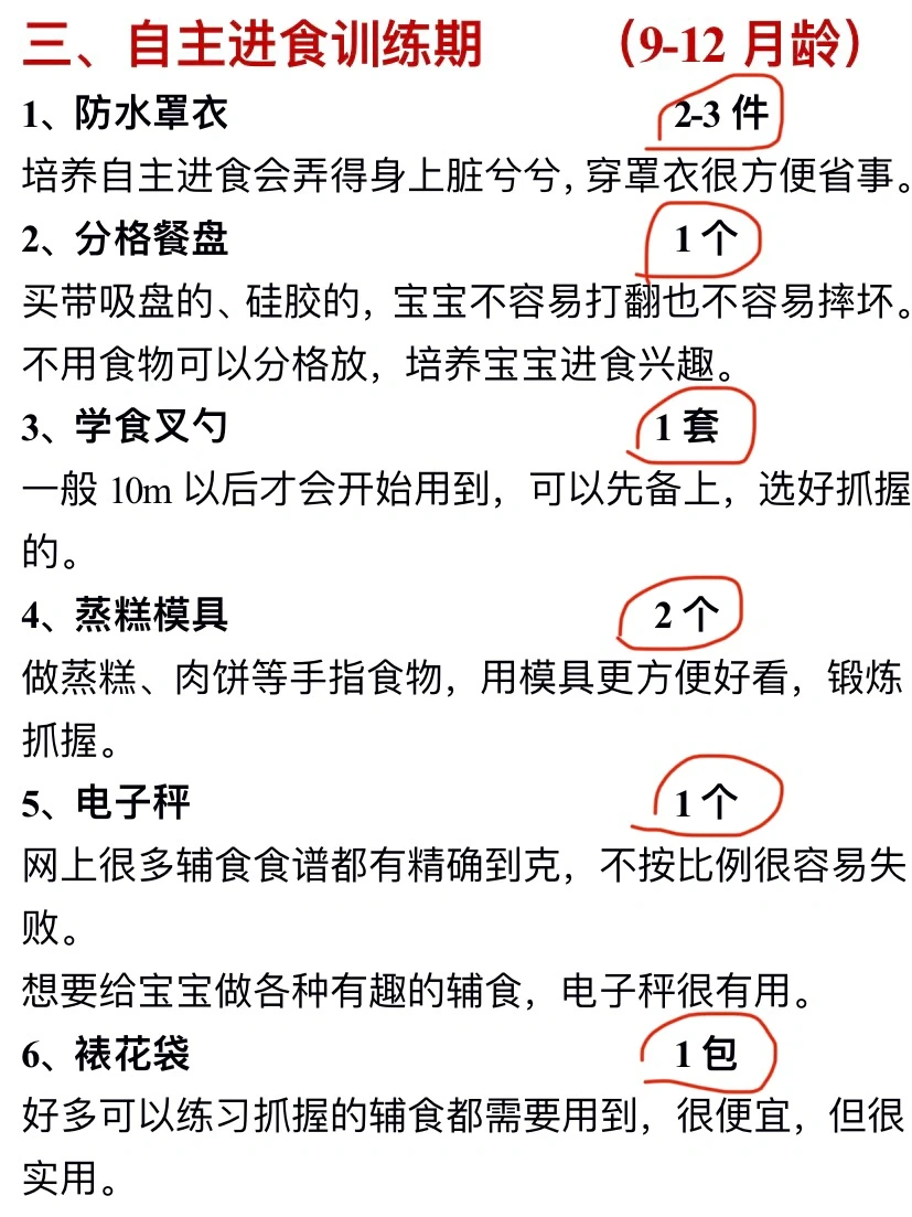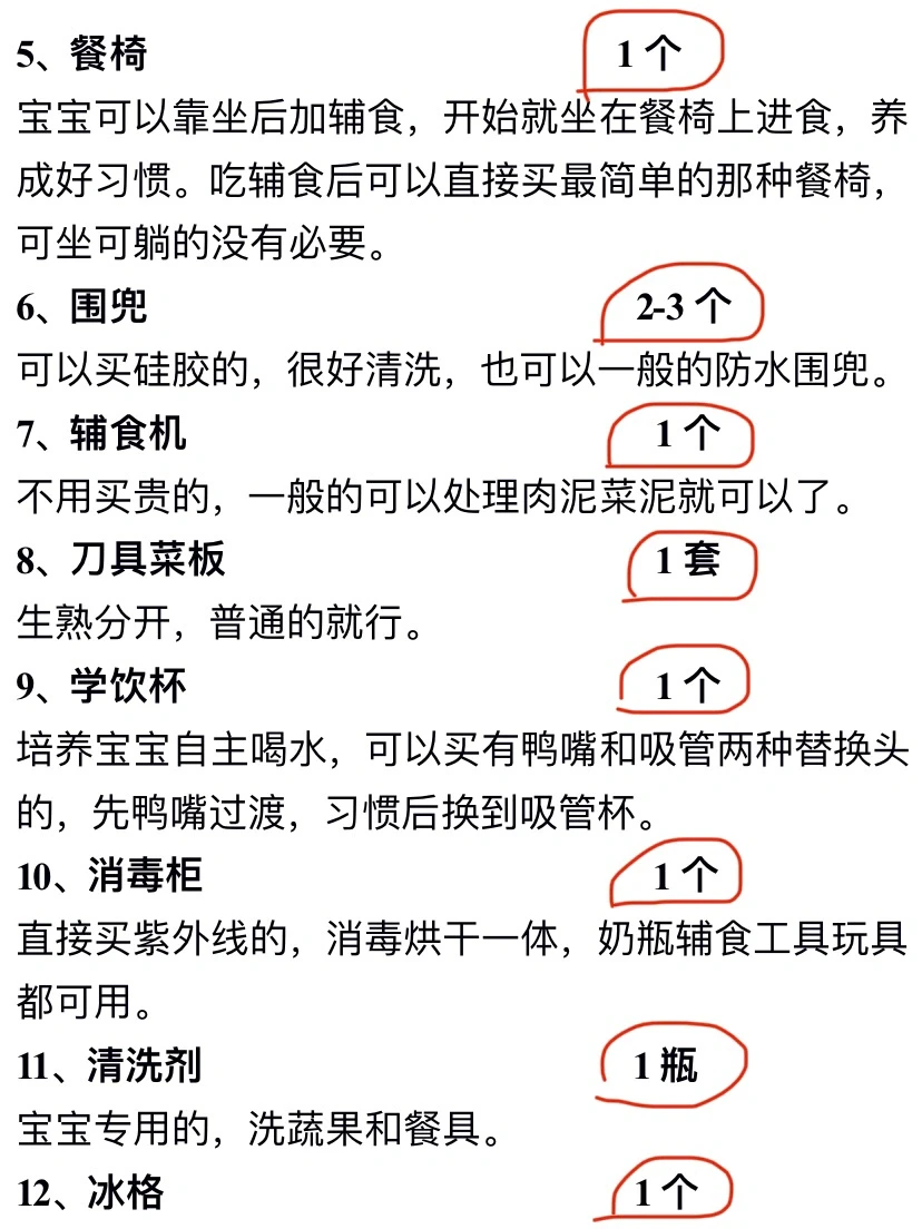 高铁米粉、辅食油、硅胶软勺、辅食碗、餐椅、围兜、辅食机、刀具、菜板、辅食机、消毒柜、清洁剂、冰格。