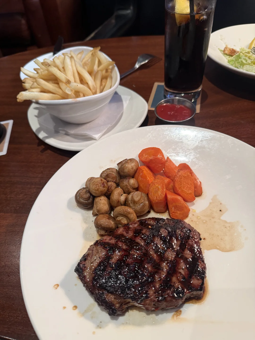 [种草R]The keg牛排一盘蔬菜给配的是green bean,我不太喜欢西餐做的四季豆,所以换成了其他蔬菜,并且我要求薯条单独放在一个盘子里,因为我不喜欢牛排的肉汁把薯条弄湿,口感大幅下降,湿乎乎的,不脆了