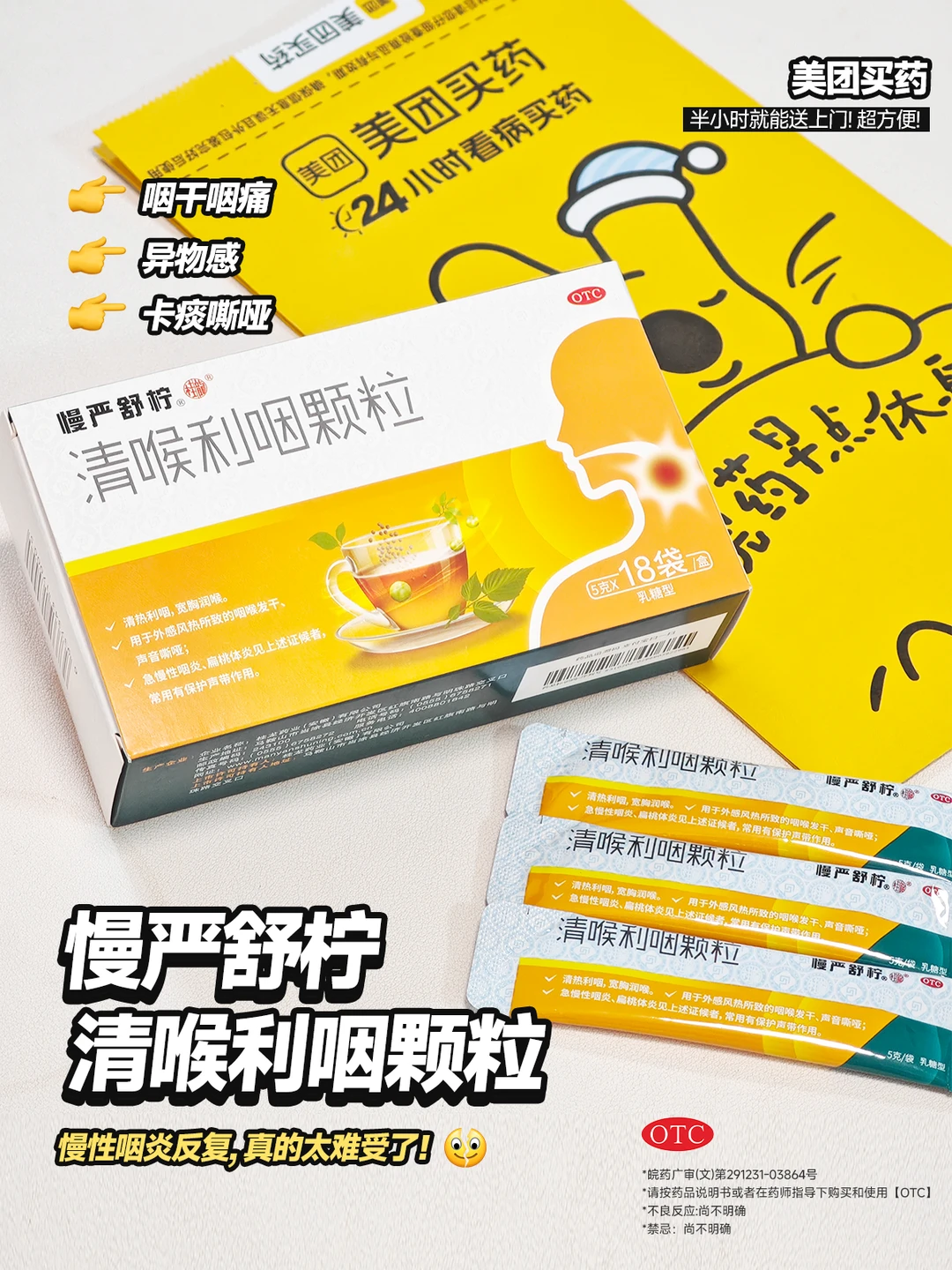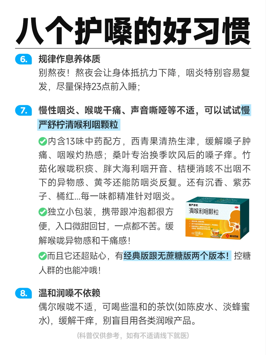 7.慢性咽炎、喉咙干痛、声音嘶哑等不适,可以试试☞☞☞慢严舒柠清喉利咽颗粒。