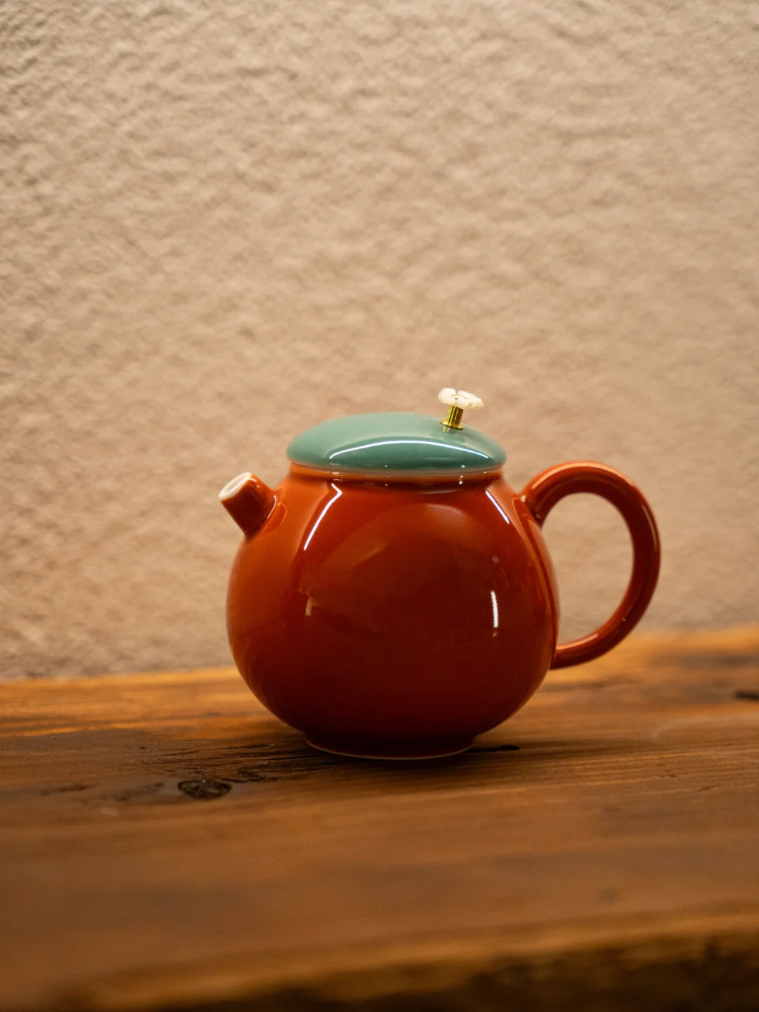 手工釉烧小茶壶,壶身采用高温柿红釉烧制,釉面莹润饱满,色泽温润大气;壶盖搭配清冽青釉,撞色设计有视觉层次