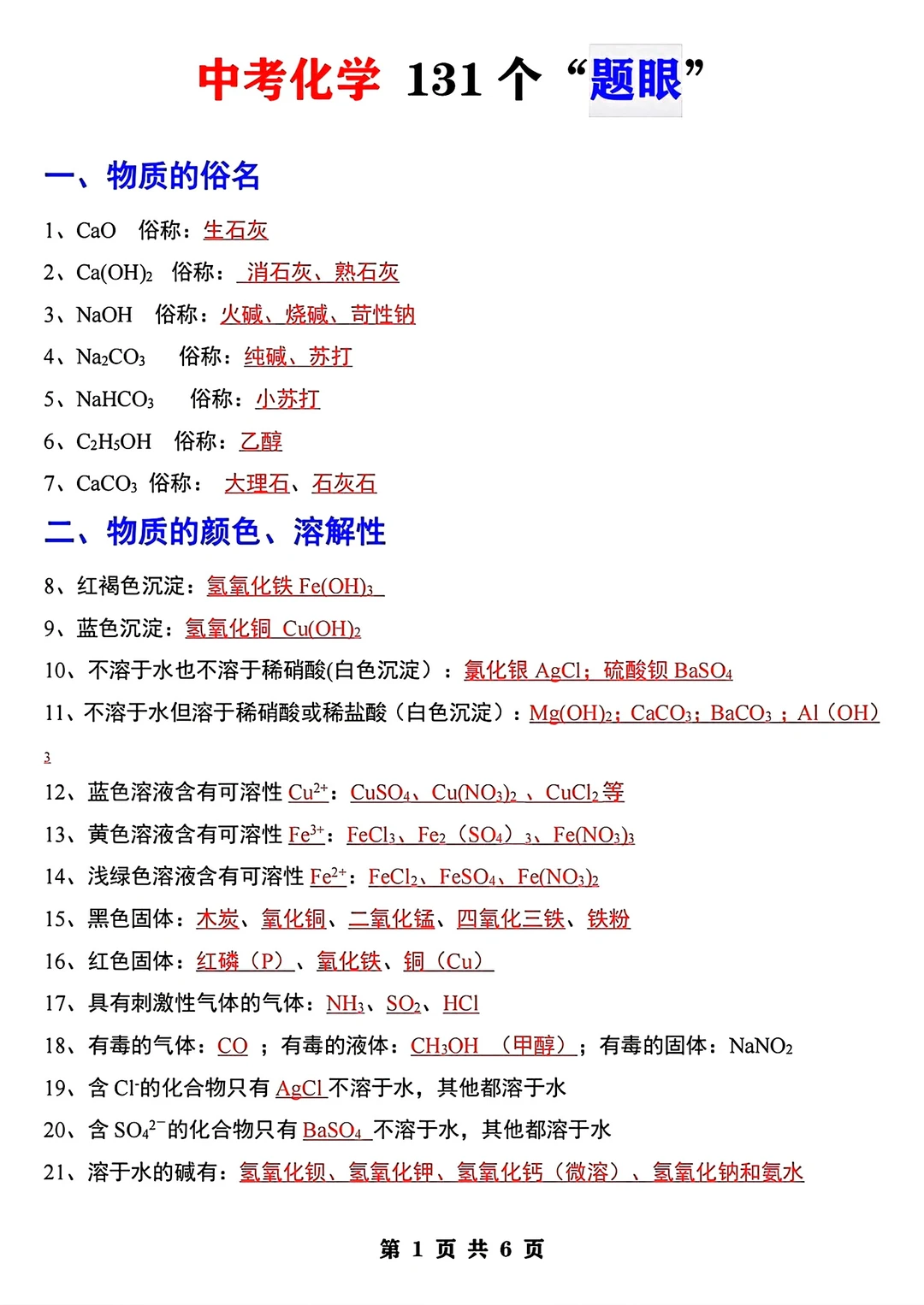 共10页pdf,2025年中考物理94个核心考点,中考化学131个题眼,适合孩子在中考前抓紧时间复习一下,物理4页,化学6页,人教版。