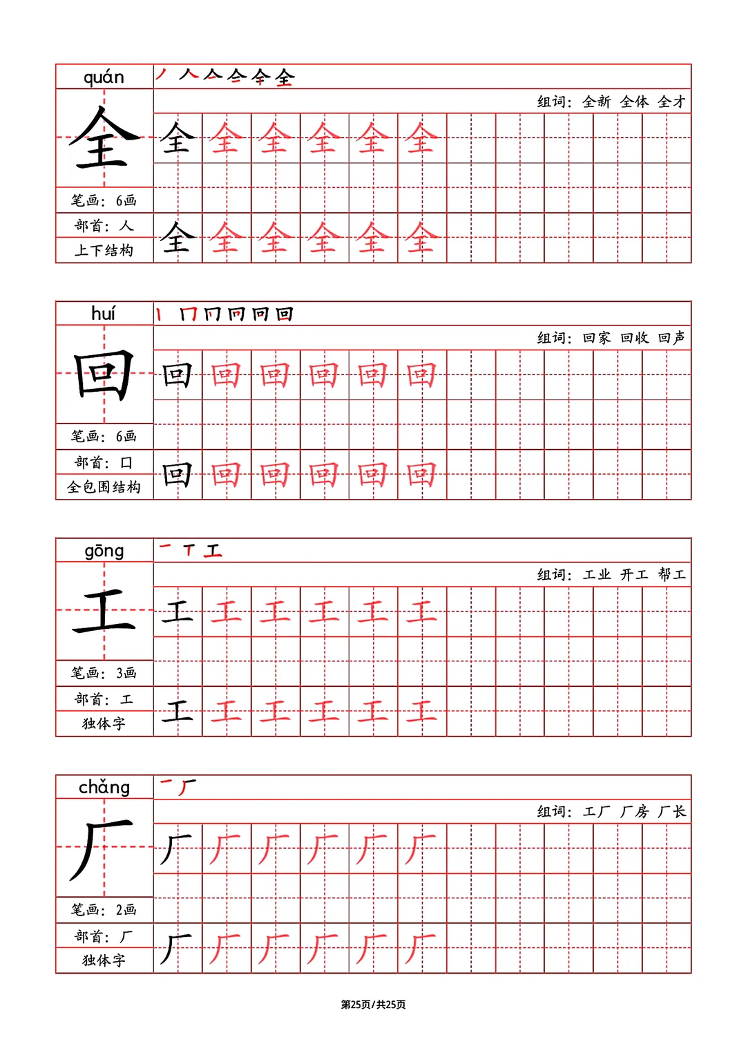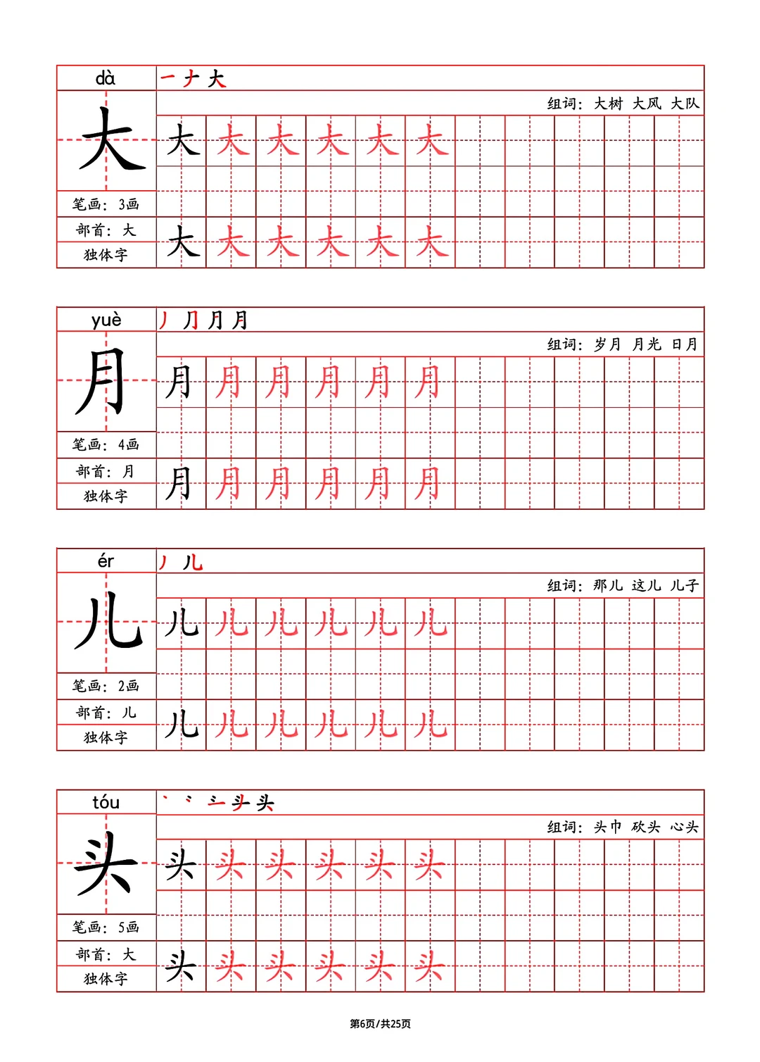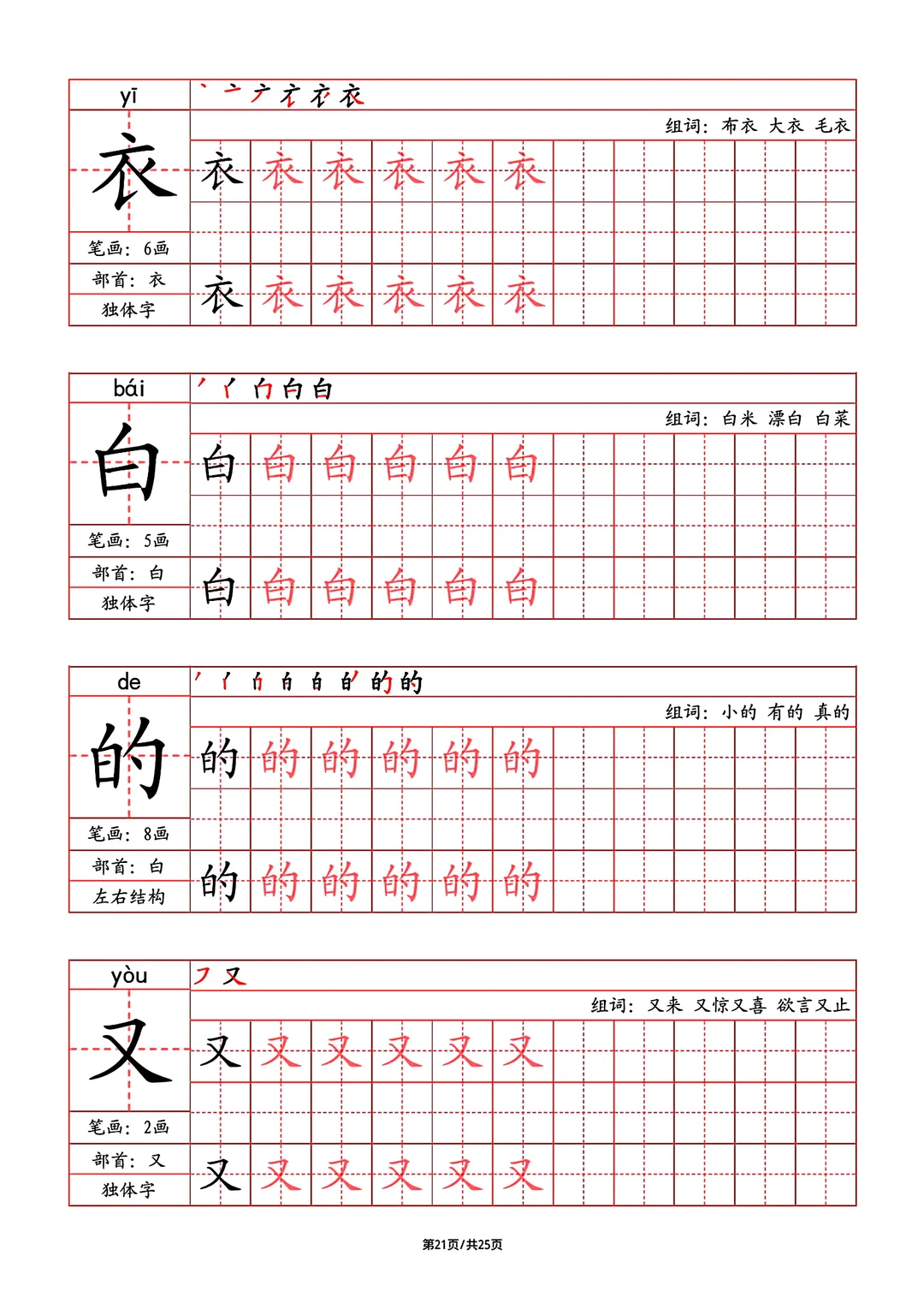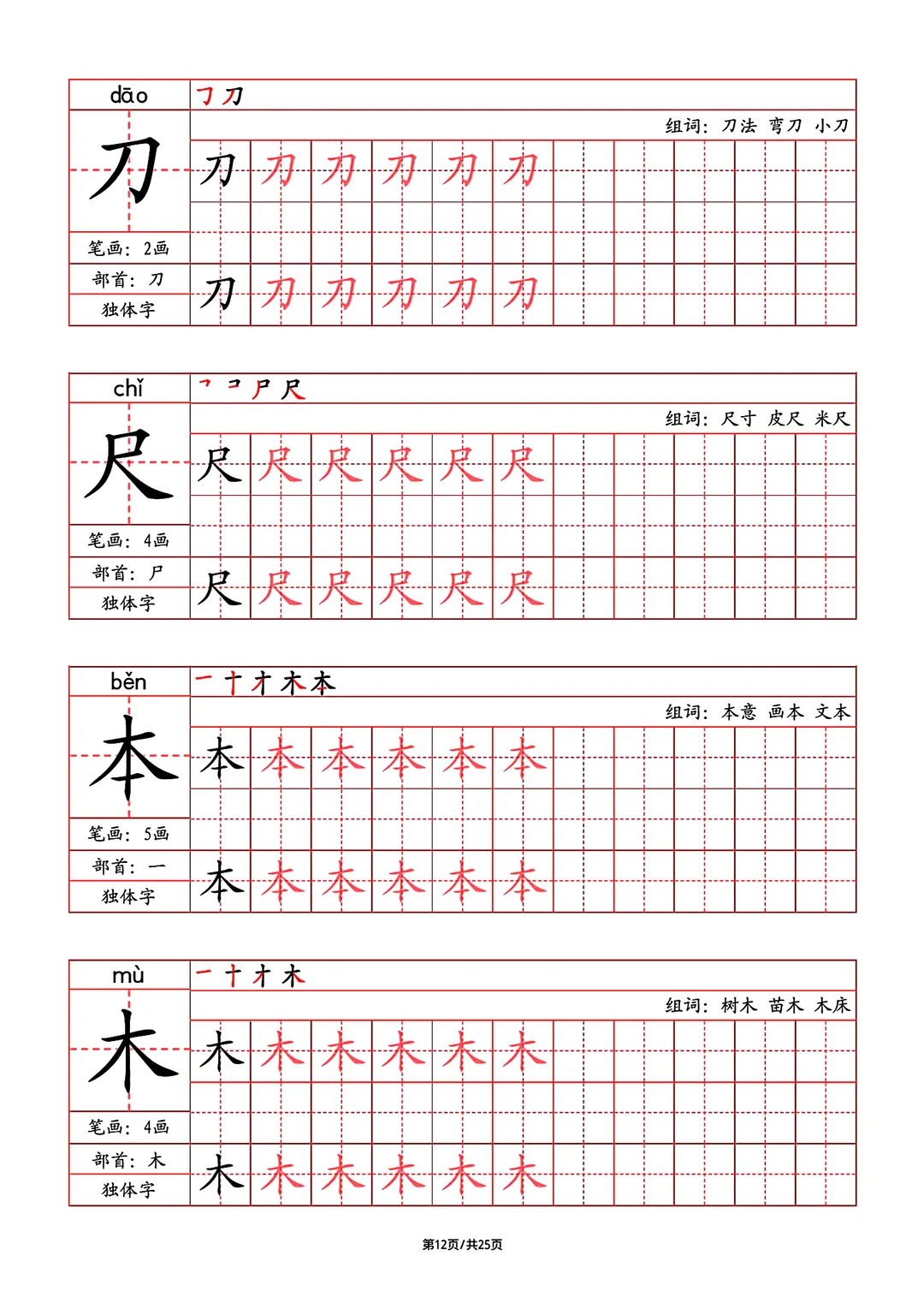 2024年秋最新版部教版人教版一年级语文字帖,写字表,字帖,笔画,部首,笔顺,组词,25页pdf,一年级上册语文字帖