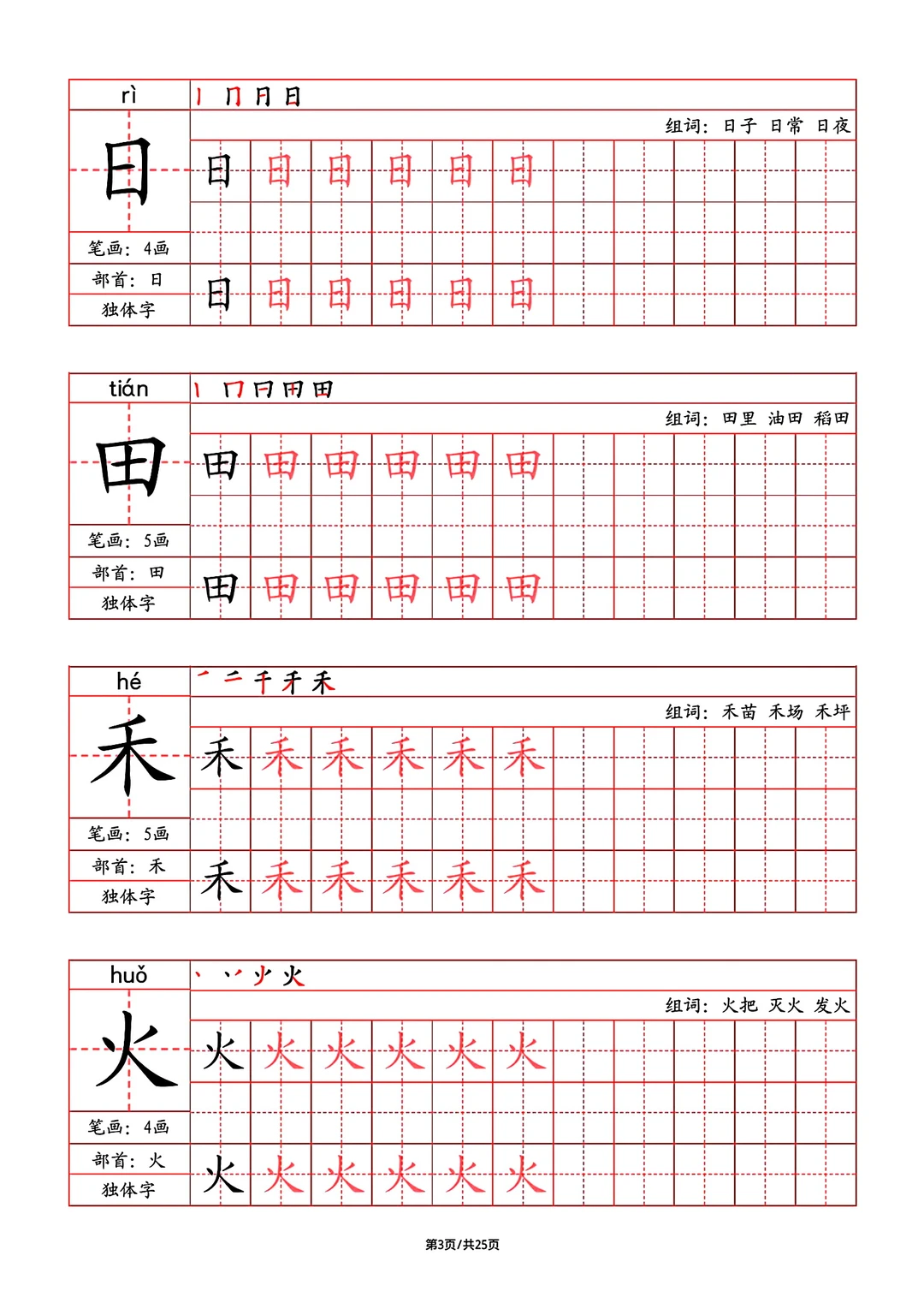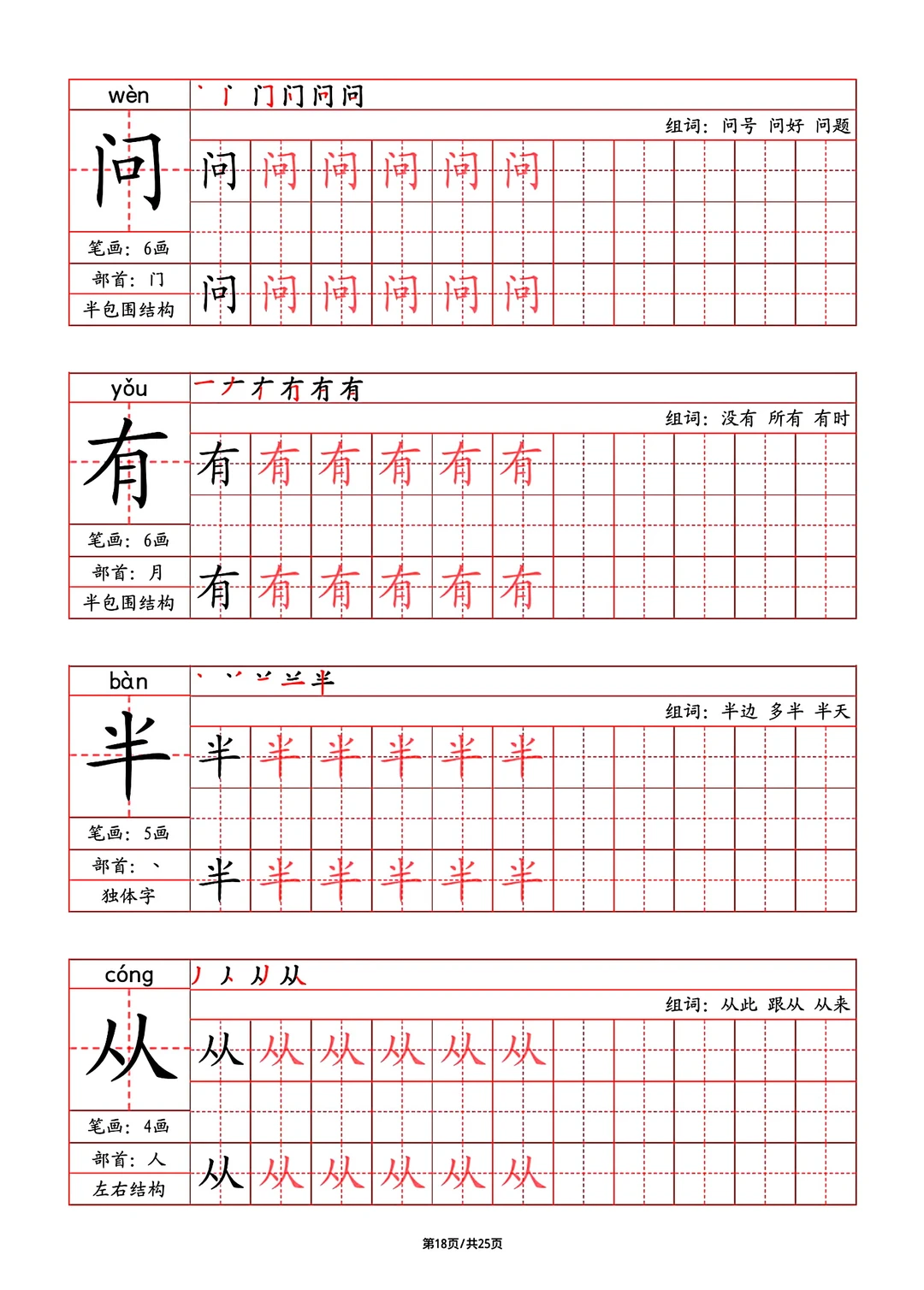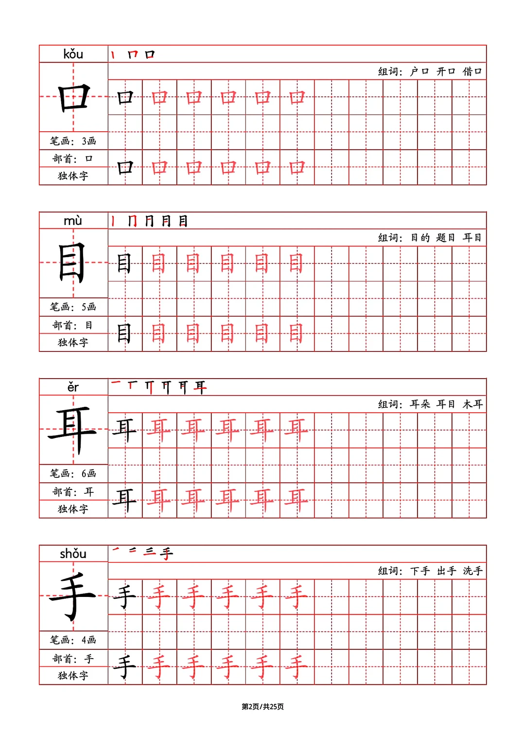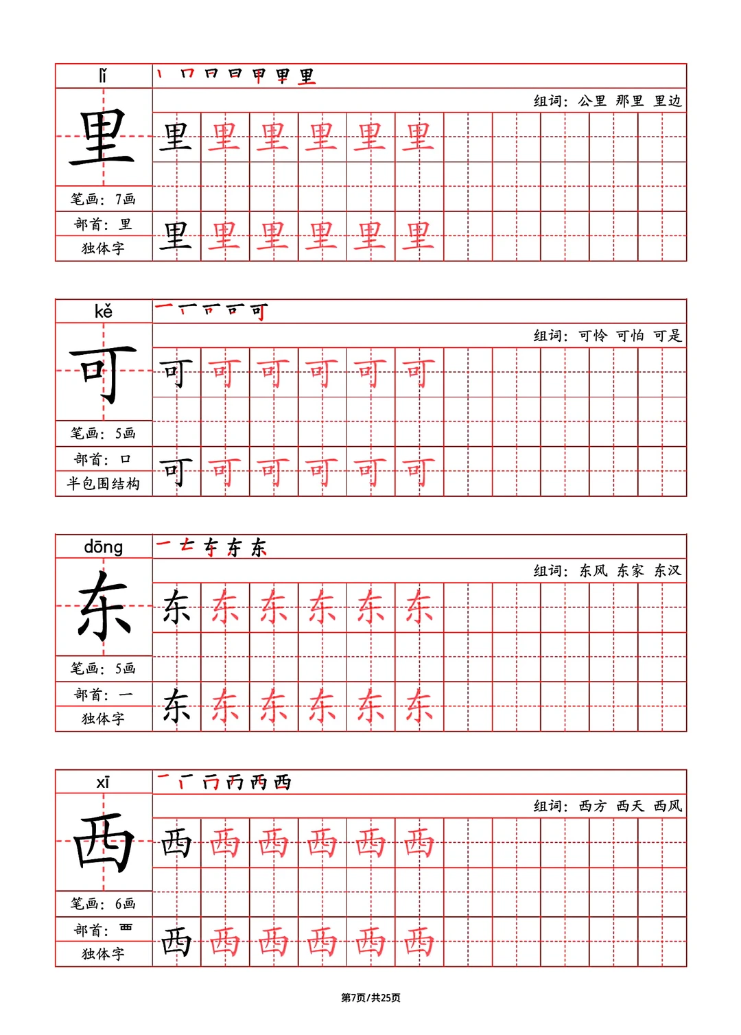 2024年秋最新版部教版人教版一年级语文字帖,写字表,字帖,笔画,部首,笔顺,组词,25页pdf,一年级上册语文字帖