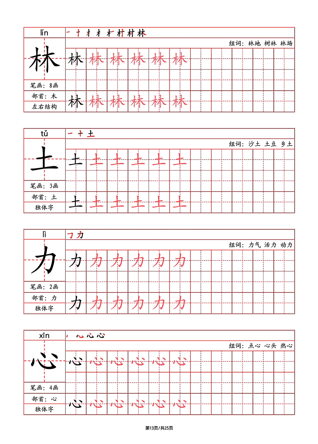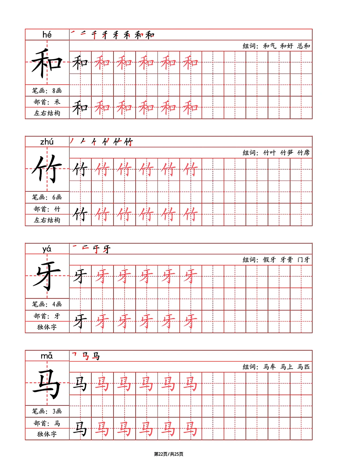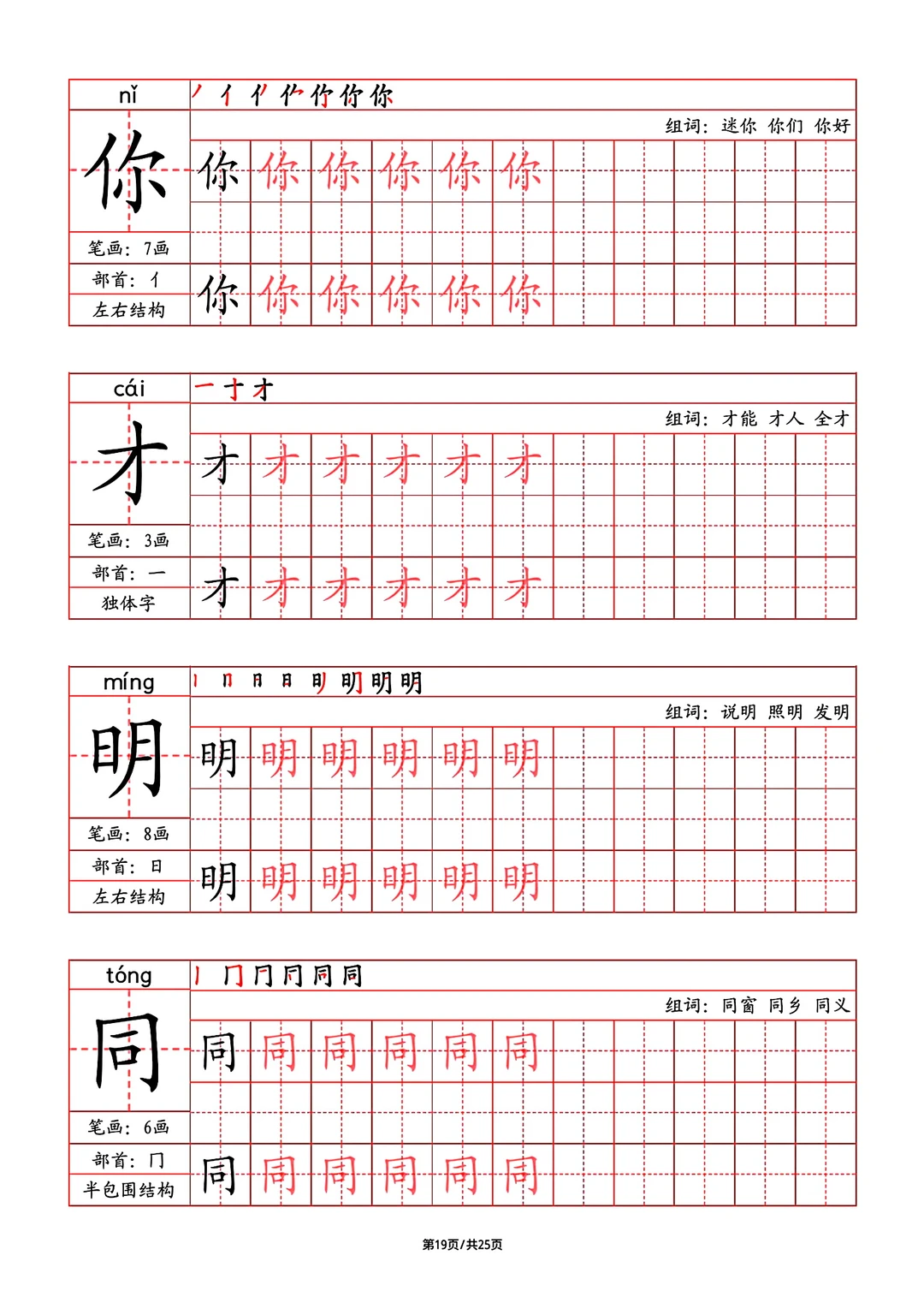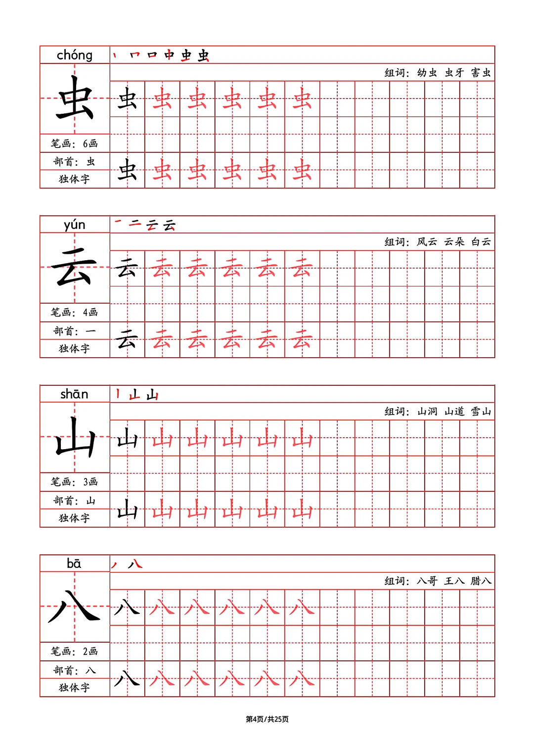 2024年秋最新版部教版人教版一年级语文字帖,写字表,字帖,笔画,部首,笔顺,组词,25页pdf,一年级上册语文字帖
