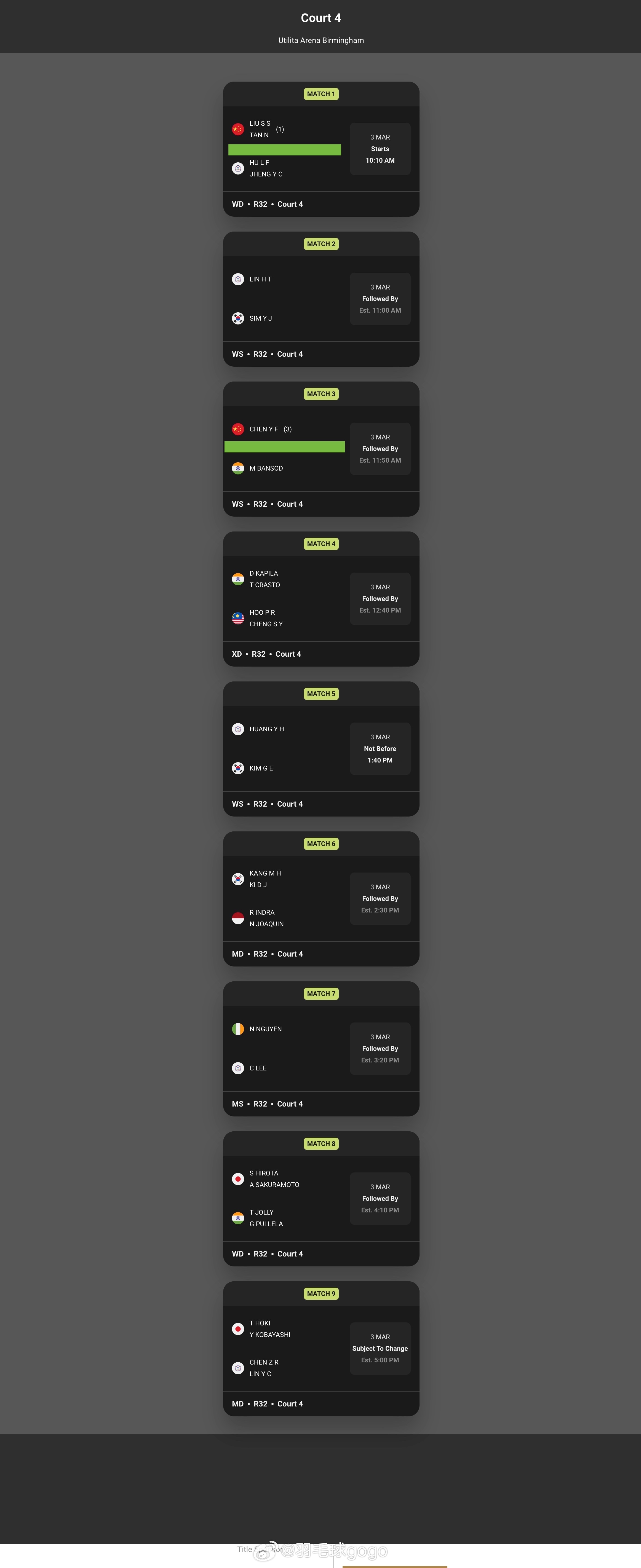 2026全英羽毛球公开赛 3月3日国羽对阵:18点