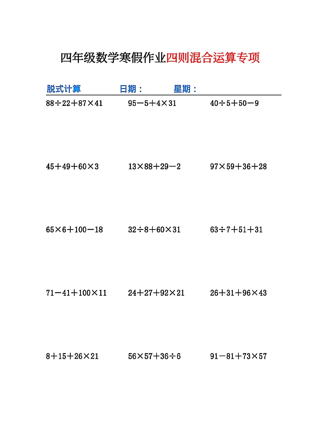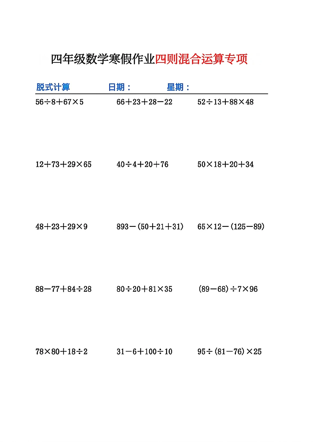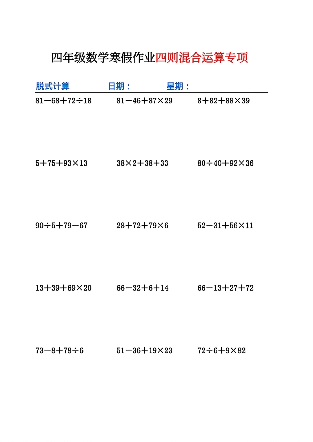 共26页pdf,我把四个好的文档组合在了一起,包含了必背的知识点与计算练习题和应用题,我认为四年级学生寒假做这些挺好的