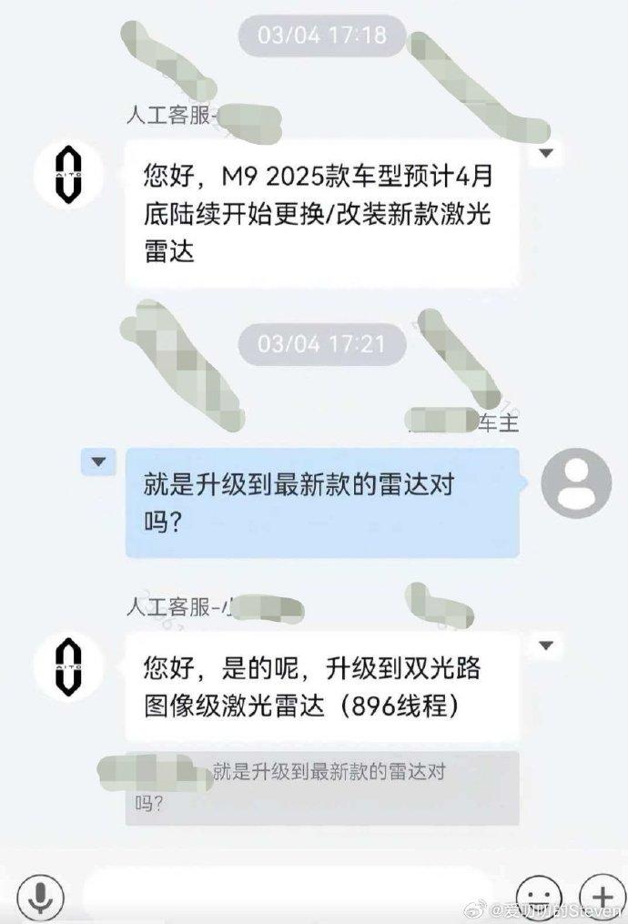 刚提了问界M9的老车主们,别急着拍大腿! 最新消息:2025款问界M9和尊界S800,可以付费升级华为刚发布的896线激光雷达!问界M9 1万,尊界S800 2万。 据博主@爱叨叨的Steven爆料,鸿蒙智行客服回应:2025款问界M9预计4月底陆续开始更换/改装新款激光雷达。注意是“改装”,不是换车! 客服说可以改,但店面还没收到官方通知。这意味着政策基本定了,就差走流程。想升级的,可以开始攒钱了![狗头] 问界M9老车主们,这1万块你掏不掏?[吃瓜群众]