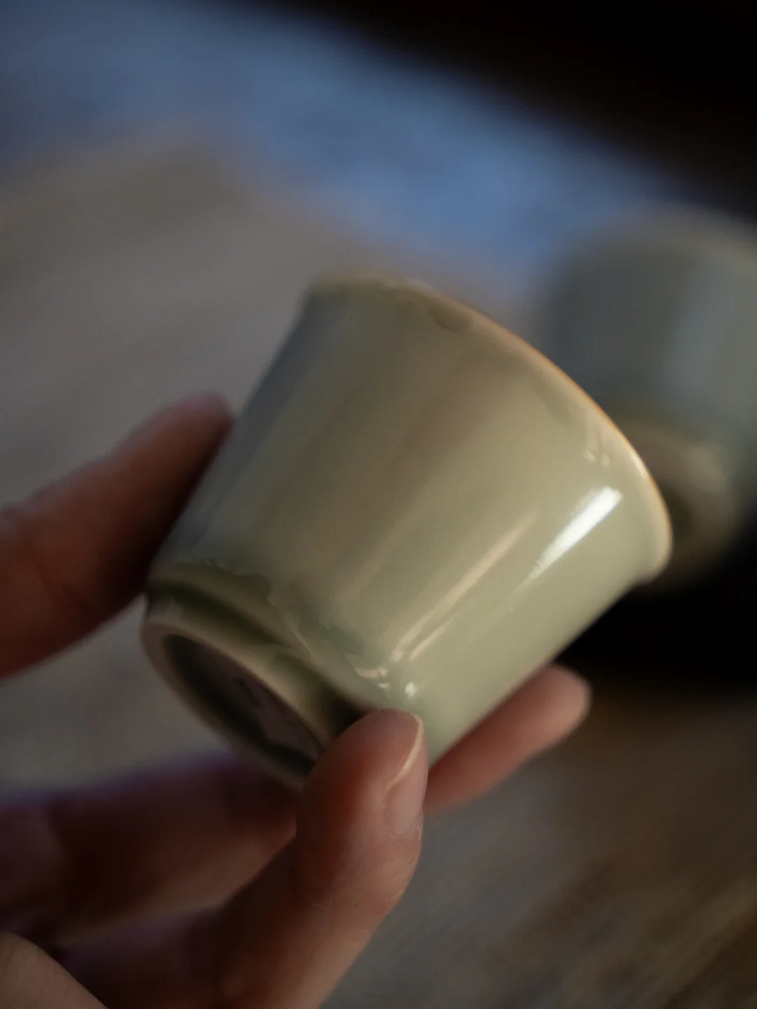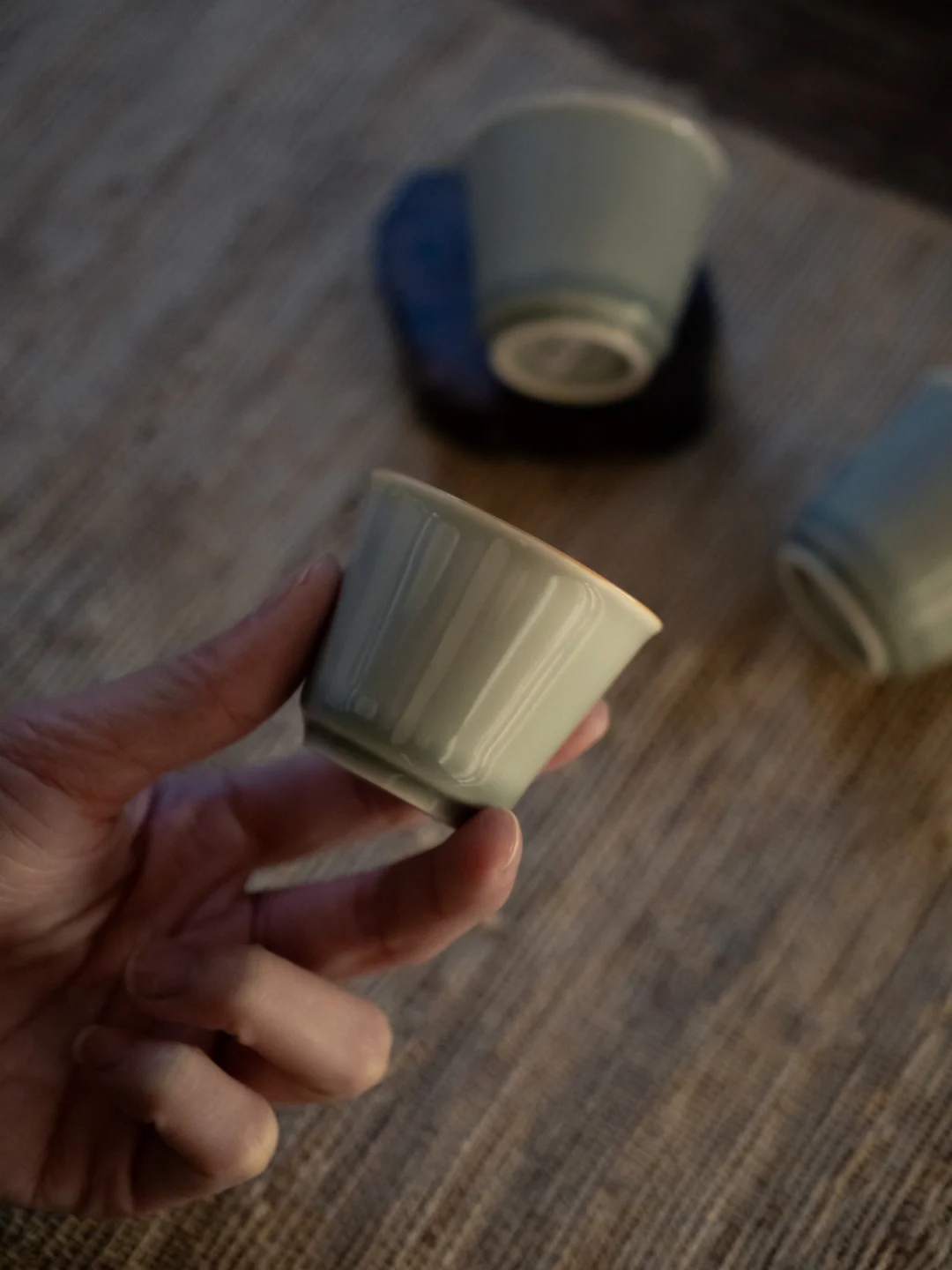 今日窗下茶席,陈设豆青釉手工品茗杯。