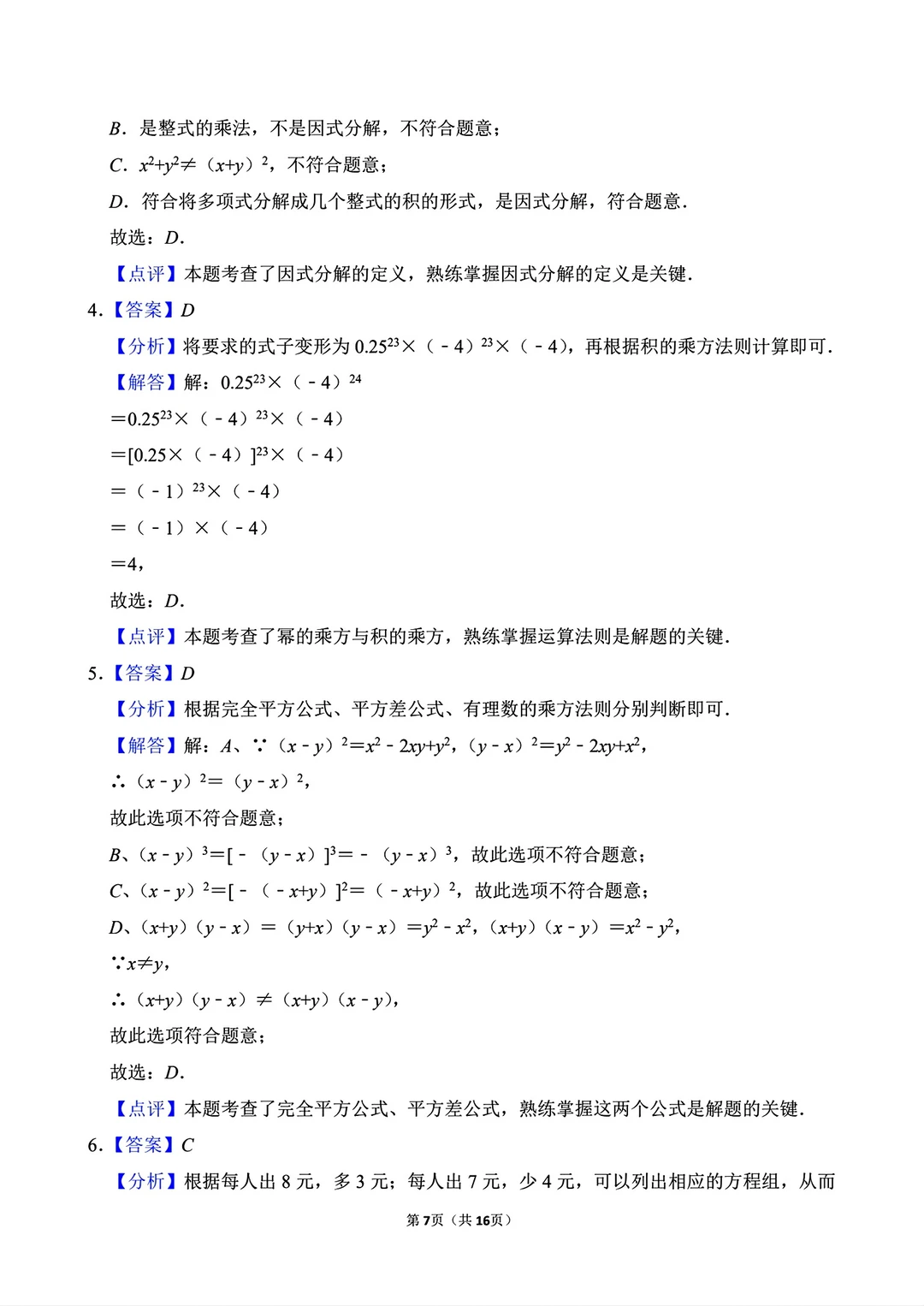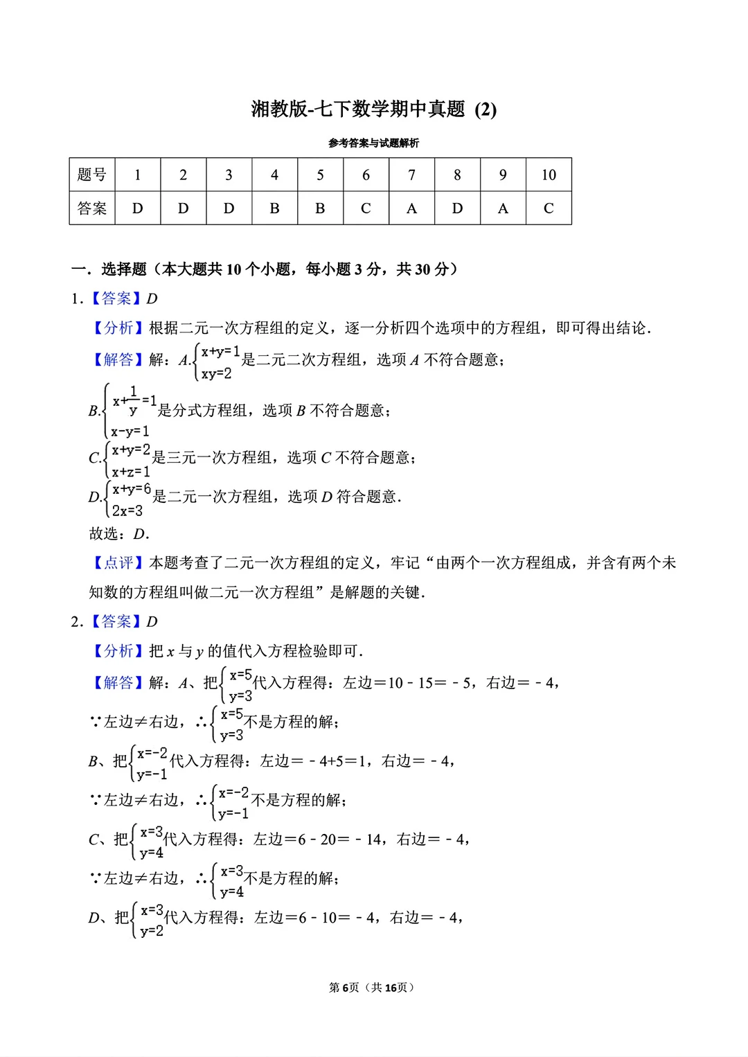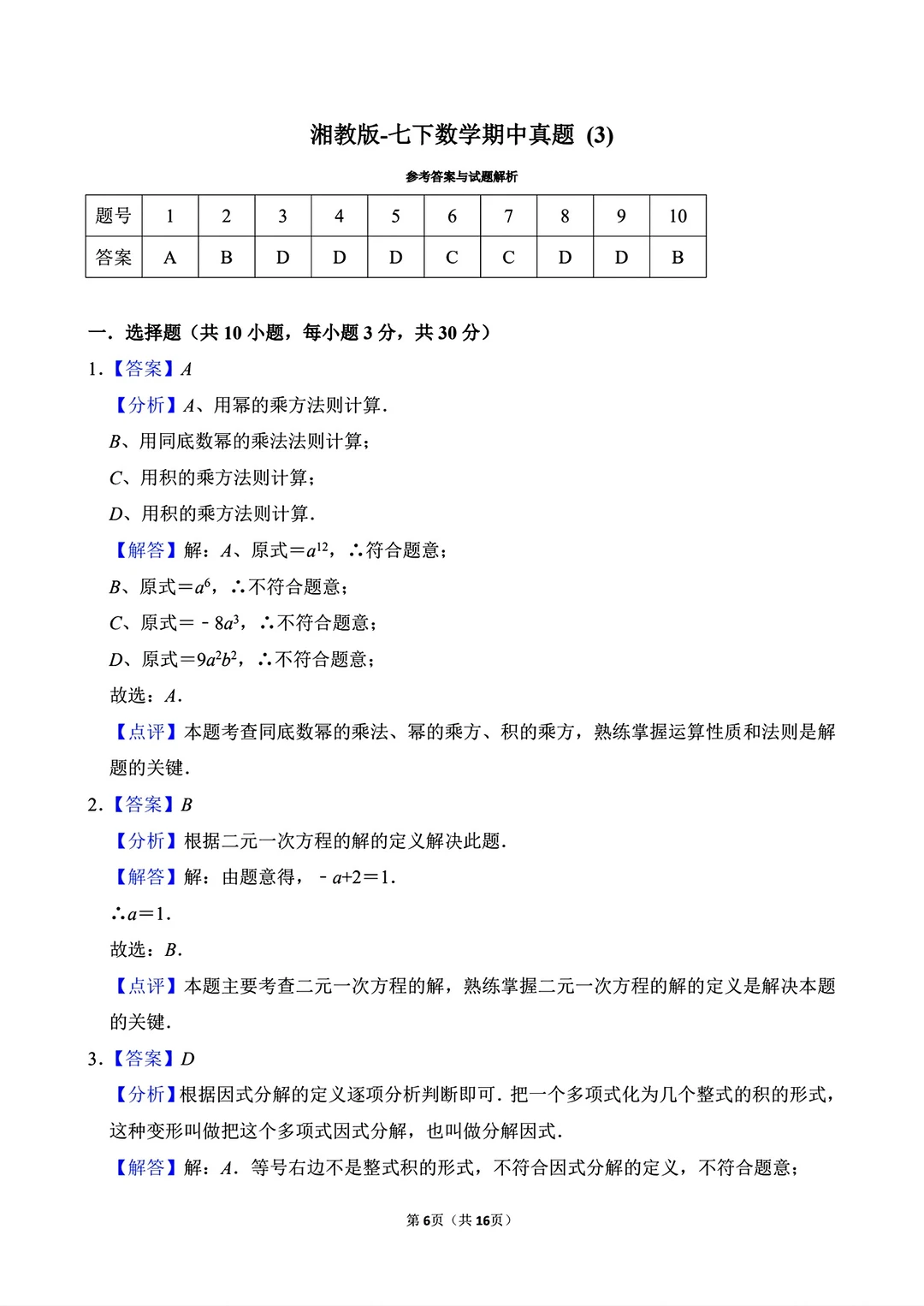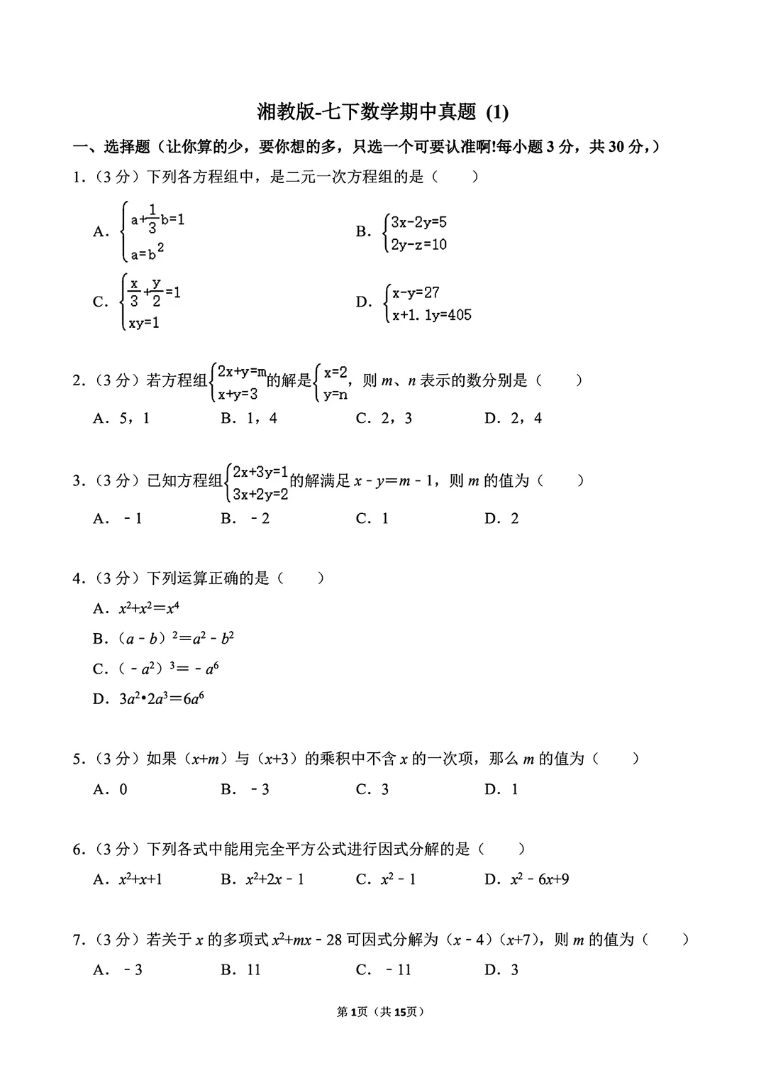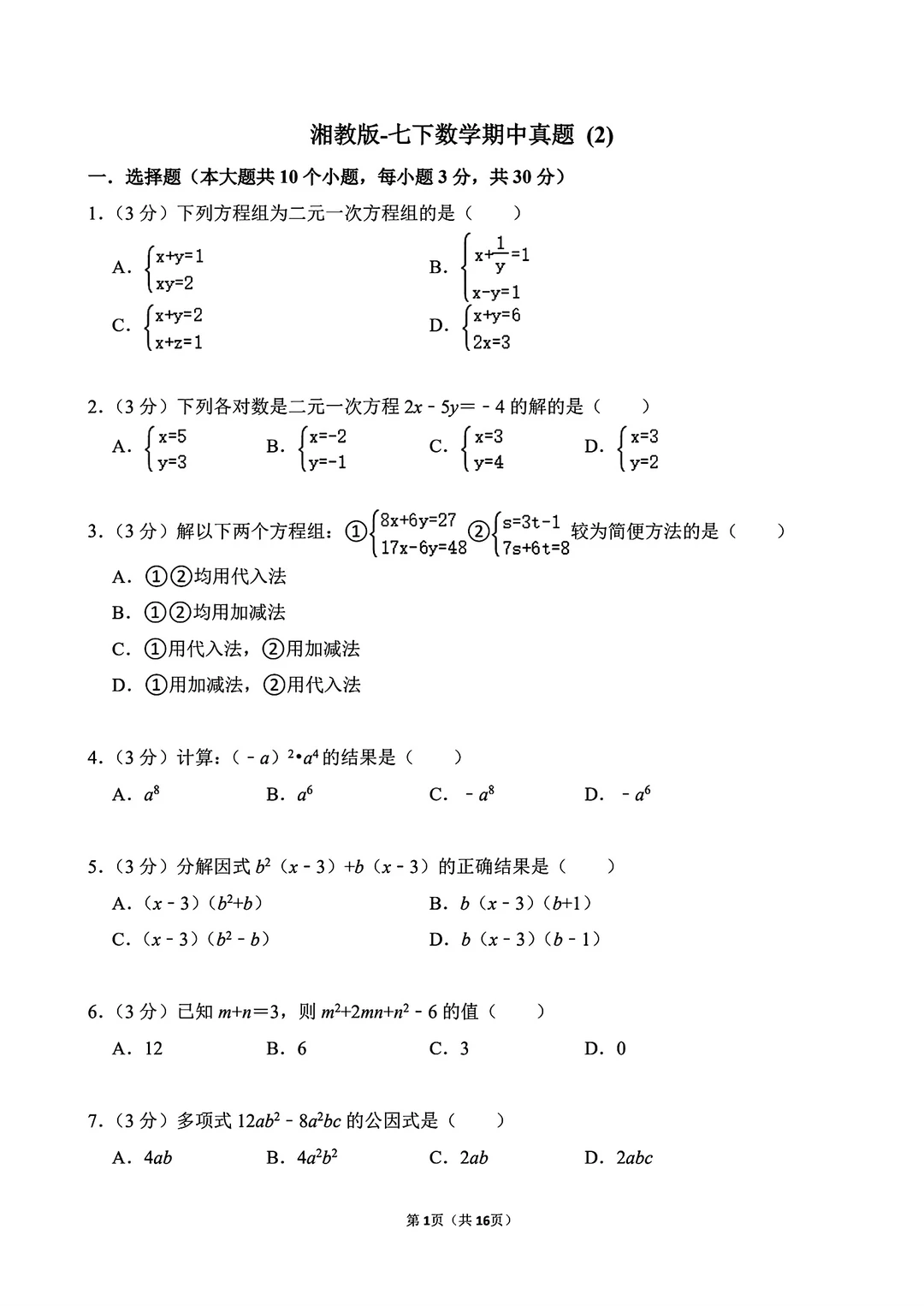 湘教版七年级下册数学期中试卷真题