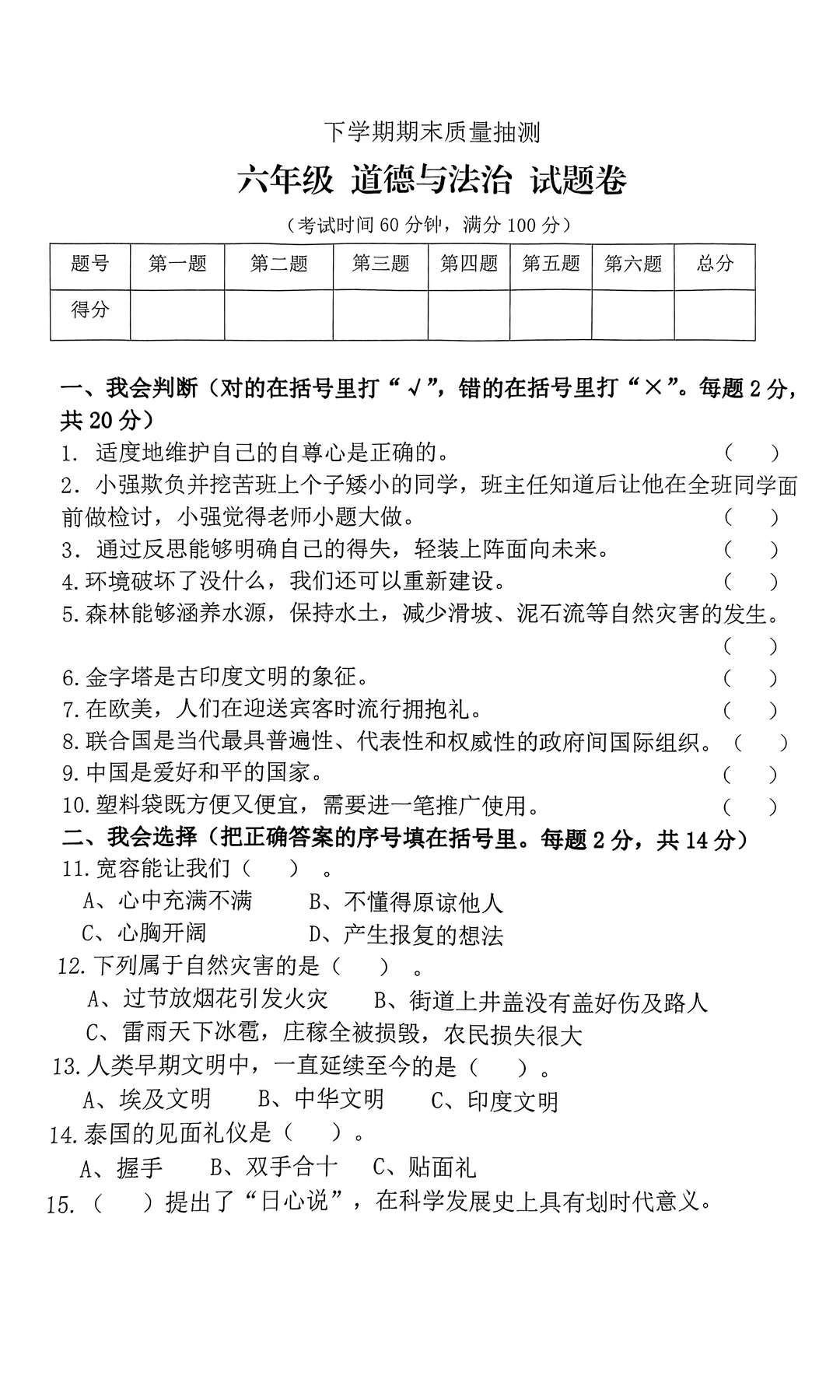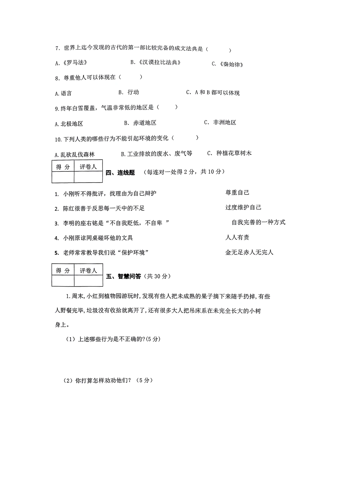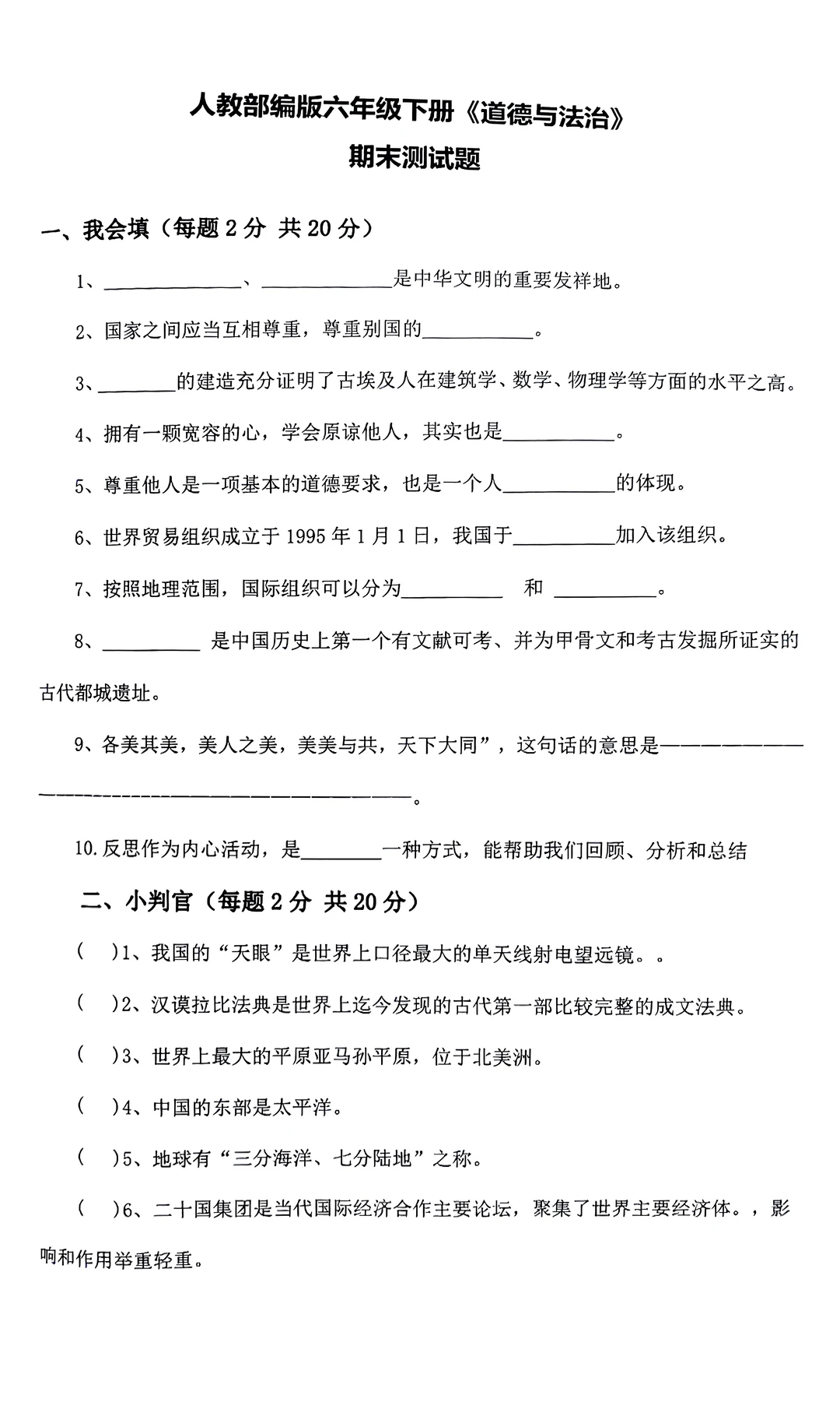 六年级下册道德与法治试卷与知识点汇总