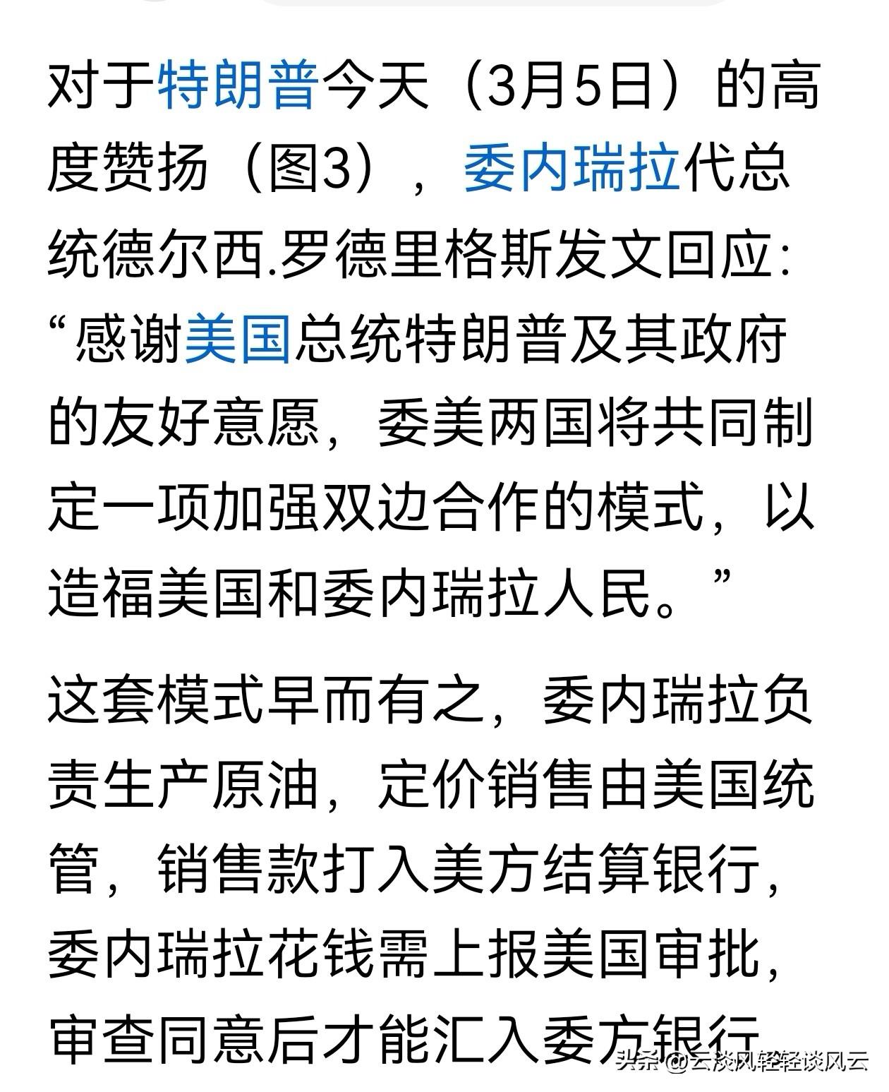 委内瑞拉负责生产原油,定价销售由美国统管,销售款打入美方结算银行,委内瑞拉花钱需上报美国审批,审查同意后才能汇入委方银行。