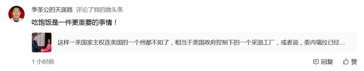 我发了一篇事关美国全面控制委内瑞拉石油的微头条(图一),看到有下面两条评论(图二、三),我在想,第一,此人怎么知道委内瑞拉人民愿意被奴役;其二,如果这件事放在中国身上,那么以这两个人为代表的很大一批人就会成为典型的汉奸,难怪中国抗日战争时那么多汉奸,而且他们还对自己的汉奸言行振振有词、理直气壮。