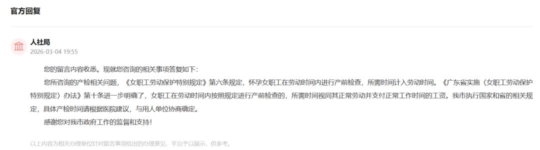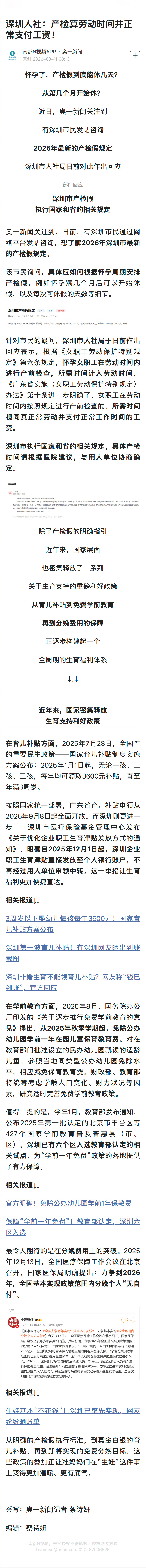 【深圳人社:产检算劳动时间并正常支付工资!】#深圳产检算劳动时间正常发工资#奥一新闻关注到,日前,有深圳市民通过网络平台发帖咨询,想了解2026年深圳市最新的产检假规定。