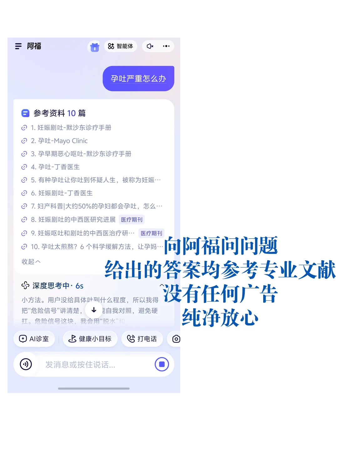 比如我问它孕中期肚子有点胀,它会引导我点选疼痛位置和时长,再给出针对性解答🥰。最最重要的一点是,全程不会推销广告,只回引用权威靠谱的医学科普,很专业,很安心。