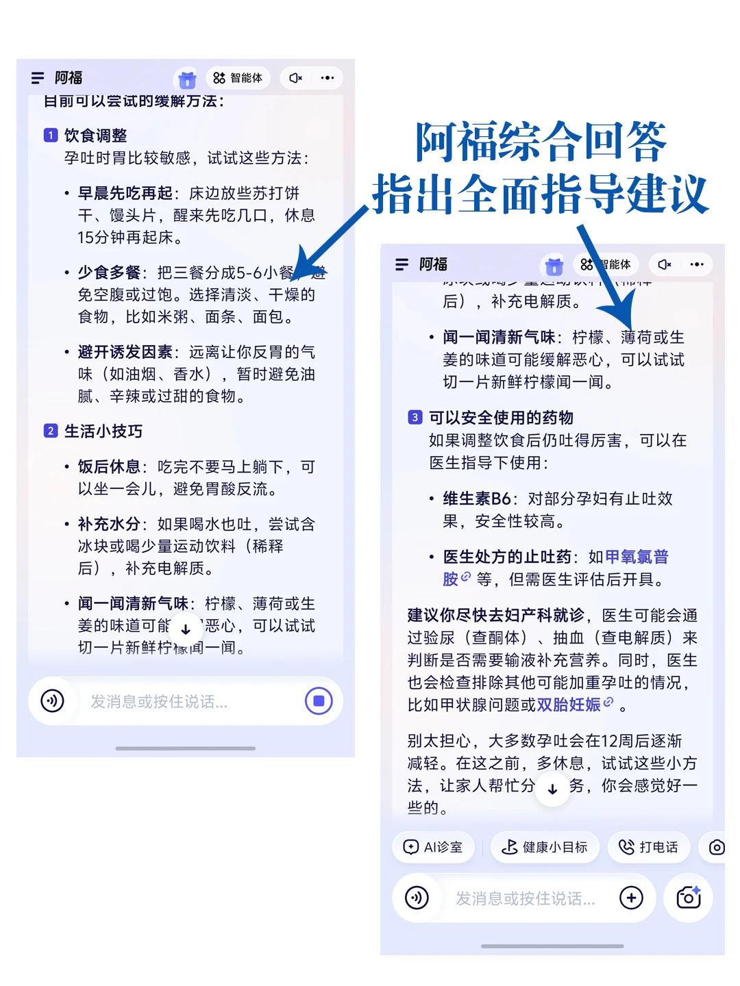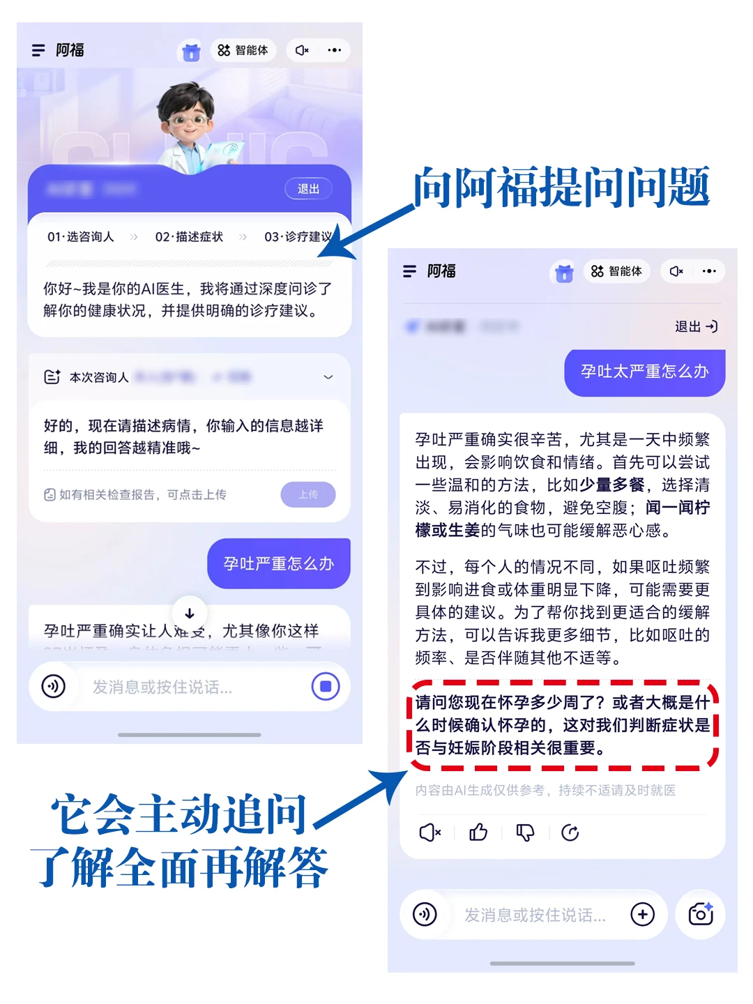 遇到身体不适,再小的问题,都可以先问问阿福,缓解焦虑情绪。它不会直接抛通用百科类回答,而是先问问题拿到更多情况,就像和大白当面交流那样。