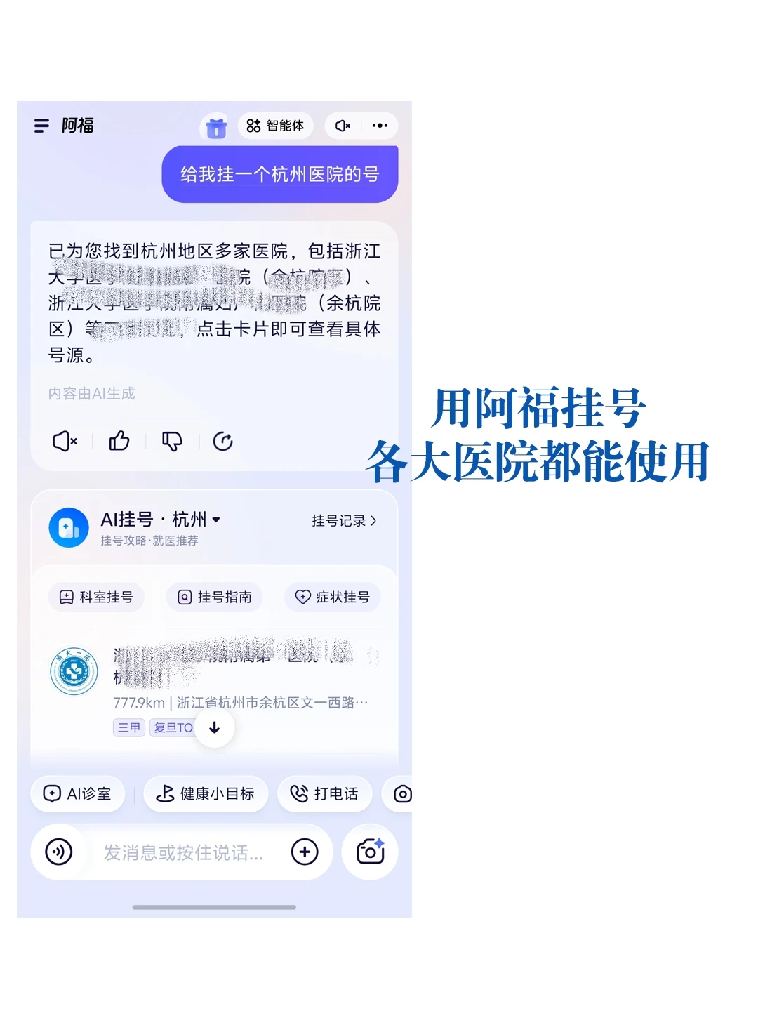 万一遇到复杂情况,我们可以在阿福里预约挂号,它会贴心推荐附近医院与对症科室、直接调出医保码支付费用。从日常自查到看病就医,不用来回切换APP,简直太方便了。