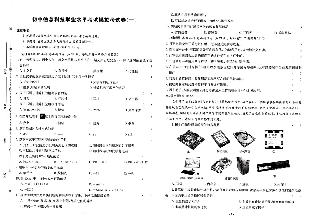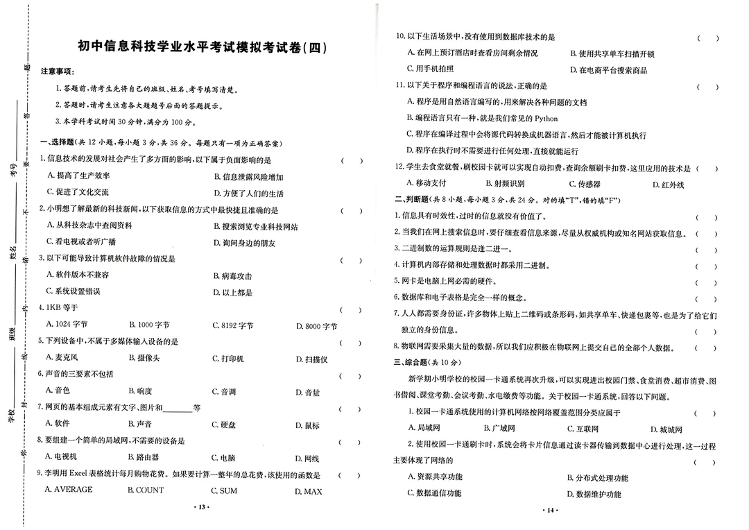 共8套试卷,有配答案,pdf版本,助力中考,初中信息科技学业水平考试模拟卷(中考夺冠),看我发笔记时间可知资料新旧程度,