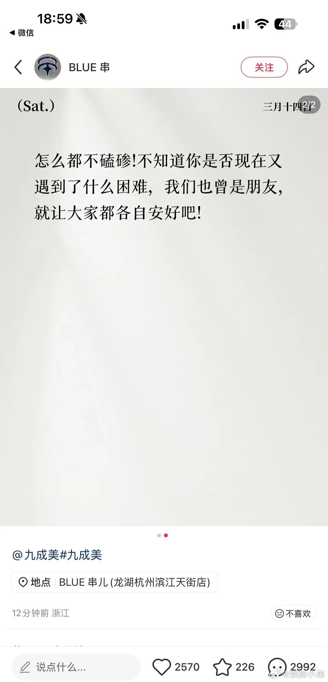 疑似田栩宁兄弟发文劝九成美疑似田栩宁兄弟劝九成美收手:他终于熬出头,你过得也不差,就让大家都各自安好吧。九成美 你要告我吗