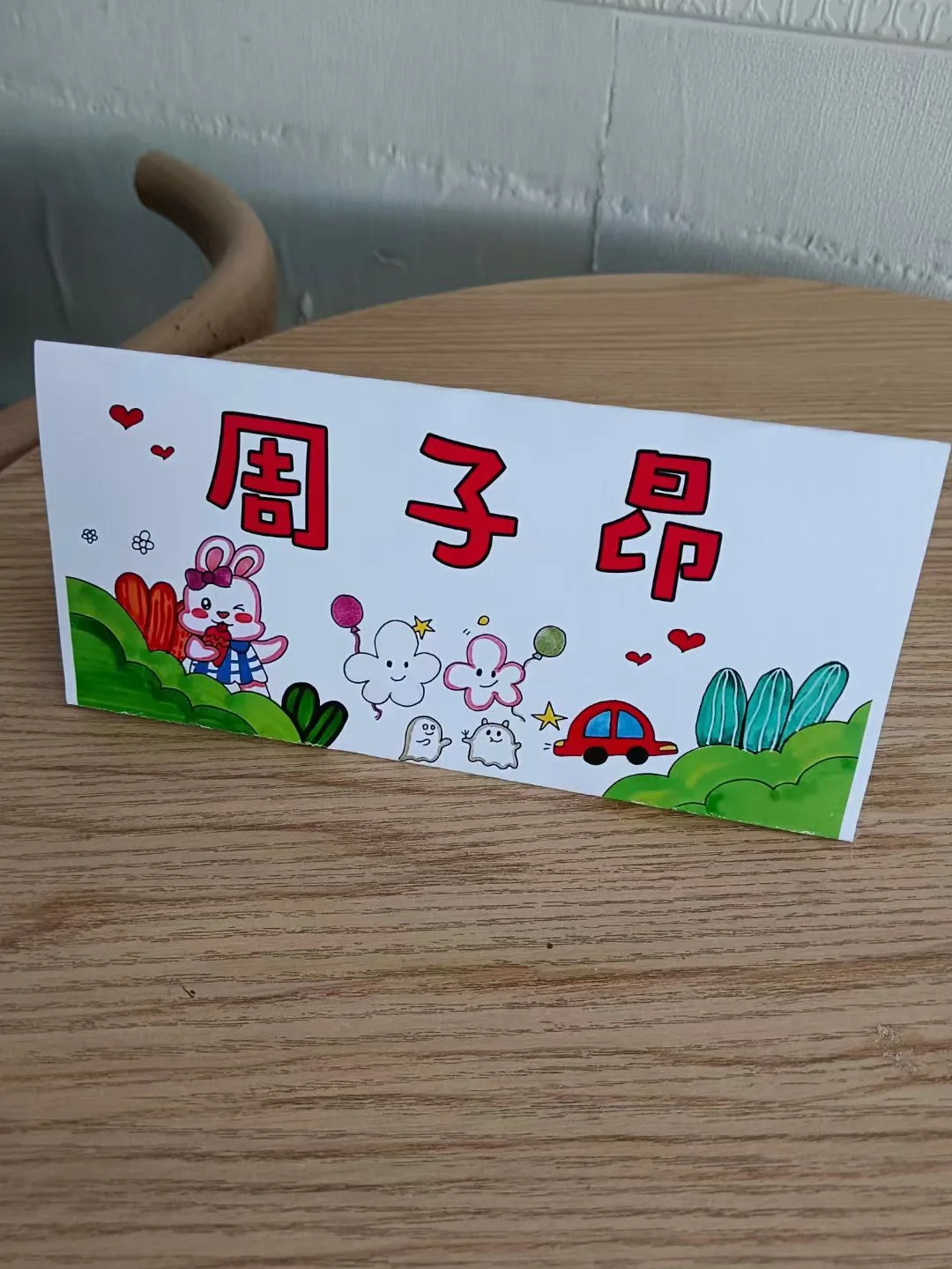 第一张图里的资料一起发,11个样式配ps模板与word模板。做图也是很费时间的,因为实体店每次开学都会要打挺多这个的,所以做了这些样式,上面写拼音的那种就是一种拼音字体,你可以自己下载,你可以下载一些可爱的字体,使用方式就是打印出来以后对折一下,然后在两头再折一下,立在桌子上就可以了,我一般用的300克的铜板纸,新生开学老师不认识学生,所以就会要求放一个这种名字牌,有些学生家长买的那种塑料的放在桌子上,他掉下来就叮叮当当的老师不喜欢
