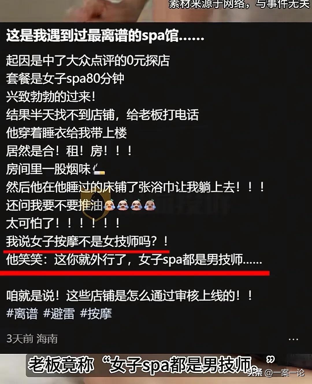 海南,女子在平台,中了0元女子spa探店,她可兴奋了,没多想就跑过去,结果找了半天,也没有找到那家店,她只好打电话,一个穿着睡衣的男技师,将她带了进店,一进店她就吓坏了,这家店居然在合租房里,环境脏乱,刺鼻的烟味扑鼻而来,男技师在他睡的床铺上放一张浴巾,就让女子躺上去,女子非常震惊,就问他难道没有女技师吗?男技师说道:“你这就外行了,女子spa都是男技师!” 离谱,实在太离谱了,这哪里是去按摩呀,简直就是去历险,稍有不慎,后果不知如何! 说起这件事,女子依然感到有些胆战心惊。 当时她在一个平台,发现自己中了一个0元女子spa探店,既然是免费的,女子当然想去体验一把,这么好的事情,不去白不去。 她说走就走,来到了平台显示这家店的地址,可来到附近,她到处找,都没有找到这家店。 无奈之下,她只好拨通了店里的电话,很快有一个男子下来了。 让女子惊讶的是,这个男子居然是穿着睡衣下来的,女子想着,有可能是这家店的老顾客,下来帮忙带顾客进店而已,她就没有多想。 她跟着男子走,结果男子把她带进了一处合租屋,女子一看是合租屋,就感觉不对劲,心里在发慌,只是她转头一想,这是0元女子spa探店,想必这家店就是开得隐秘些,才会推出这个活动,让更多人知道这家店,她决定一探究竟。 她跟男子进店了,进到店的那一刻,女子怀疑自己进了黑店,只见这家店环境非常脏乱,刚进店,一股刺鼻的烟味就扑鼻而来,让她不由自主地皱起了眉头。 她带着一肚子的疑惑,想知道这店为何开在合租屋里,还没有等她搞清楚。 只见带她进来的那位男子,就是男技师,他往他睡过的床,在上面放着上一张浴巾,就让女子躺上去。 女子震惊了,在她面前站的是一个穿着睡衣的男技师,这里的环境又那么脏,那么乱,烟味刺鼻,足以证明这里的卫生条件让人堪忧,这家店到底是不是正规的,女子心中更是泛起了疑团。 还没等她问清楚问题,男技师就问她,要不要推油,一个穿着睡衣的男技师,一张男技师睡的床,联想到这些,女子害怕了。 她小心翼翼地问,怎么没有女技师呢? 结果男技师笑着说道:“这你就外行了,女子spa点的都是男技师!” 到底是女子外行了,还是这家店另有秘密? 此地不宜久留,女子看到店里的环境,看着穿着睡衣的男技师,又看着男技师睡的床,她已经不想体验了,即使是免费的,她觉得自己也无福消受,她只想赶紧离开这个地方。 经历这么一回事,女子心中依然心有余悸,她不知道,如果自己真的贪便宜,去体验,后果到底是怎样,她不敢想象。 离开了这家店,她想起店里的环境,想起这家店的地址,她回想起男技师所说的话,她满心疑惑,这样的店为何会通过平台的审核。 女子再次到平台看了看这家店,只见这家店,上面的评论是好评居多,并且在上面展示的环境,是非常优雅的。 如此优雅的环境,吸引了女子过去,0元体验,更是让女子不假思索地过去,结果却体验了惊心动魄。 女子经历了这件事,将这家店的具体情况发布了出来,目前这家店已经在平台下架了。 那么出现这样的事情,反映了哪些问题呢? 这家店如果确实环境脏乱,味道刺鼻,地点偏僻,达不到开店的条件,那么这家店不属于正规的店。 违法开店,是要受到处罚的。 《市场主体登记管理条例》第43条规定,对于未经设立登记从事经营活动的行为,登记机关将责令其改正,并没收违法所得。 来这家店按摩,如果里面都是男技师,按摩的又是女子,女子很容易吃亏,一旦女子受到侵犯,这家店是需要承担责任的。 那么你对这样的店有何看法呢?