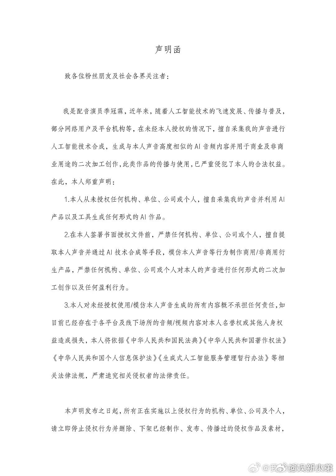 季冠霖反对ai季冠霖发文声明反对ai太支持了,ai现在越来越猖狂了不只是采集明星的声音,还有各种人脸采集,越来越过火了