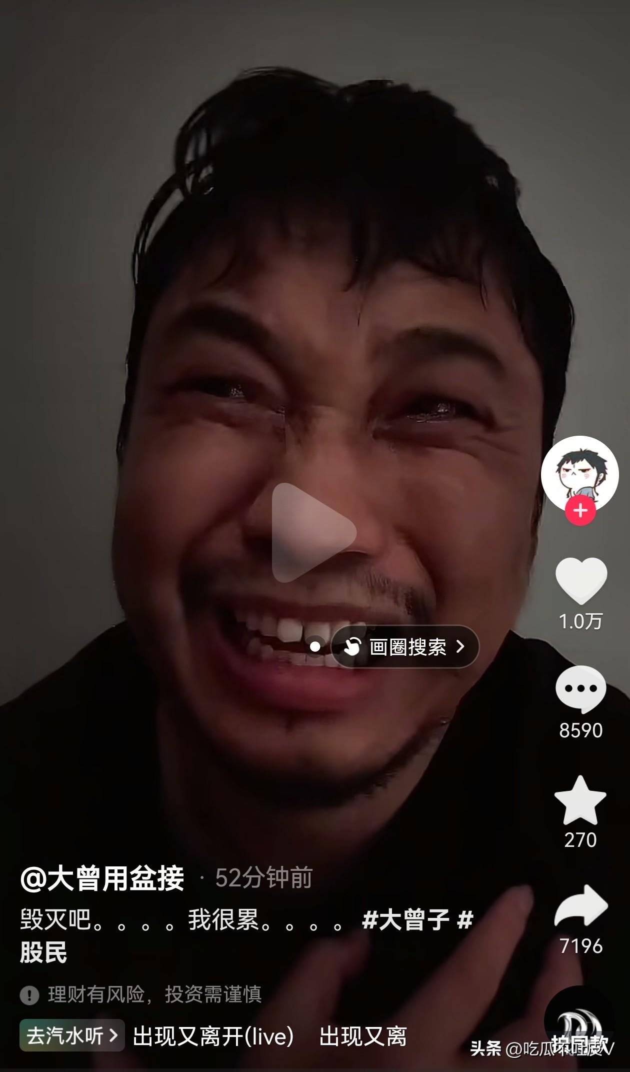 大曾子怒亏 2 万块,今天没有滴眼药水,全是真情流露,亏得整个人都不好了,好像他已经六连亏还是七连亏了,前几天充值的七万块估计已经没了,30 万底线再次被击穿,已经差不多绝望了,不知道今天有没有割肉清仓!