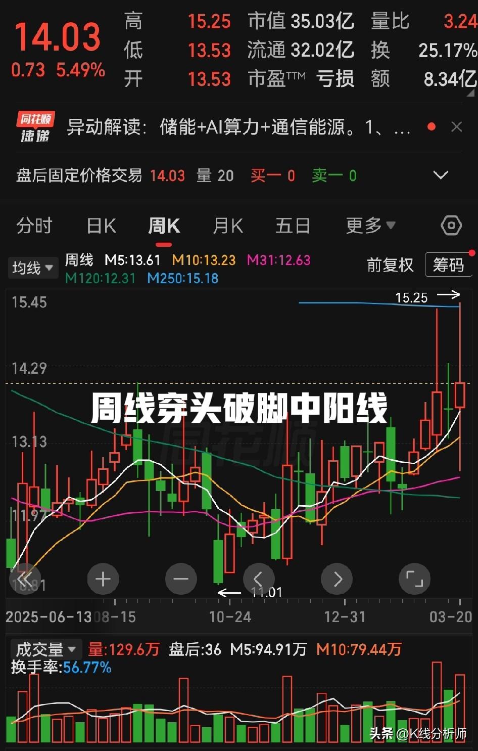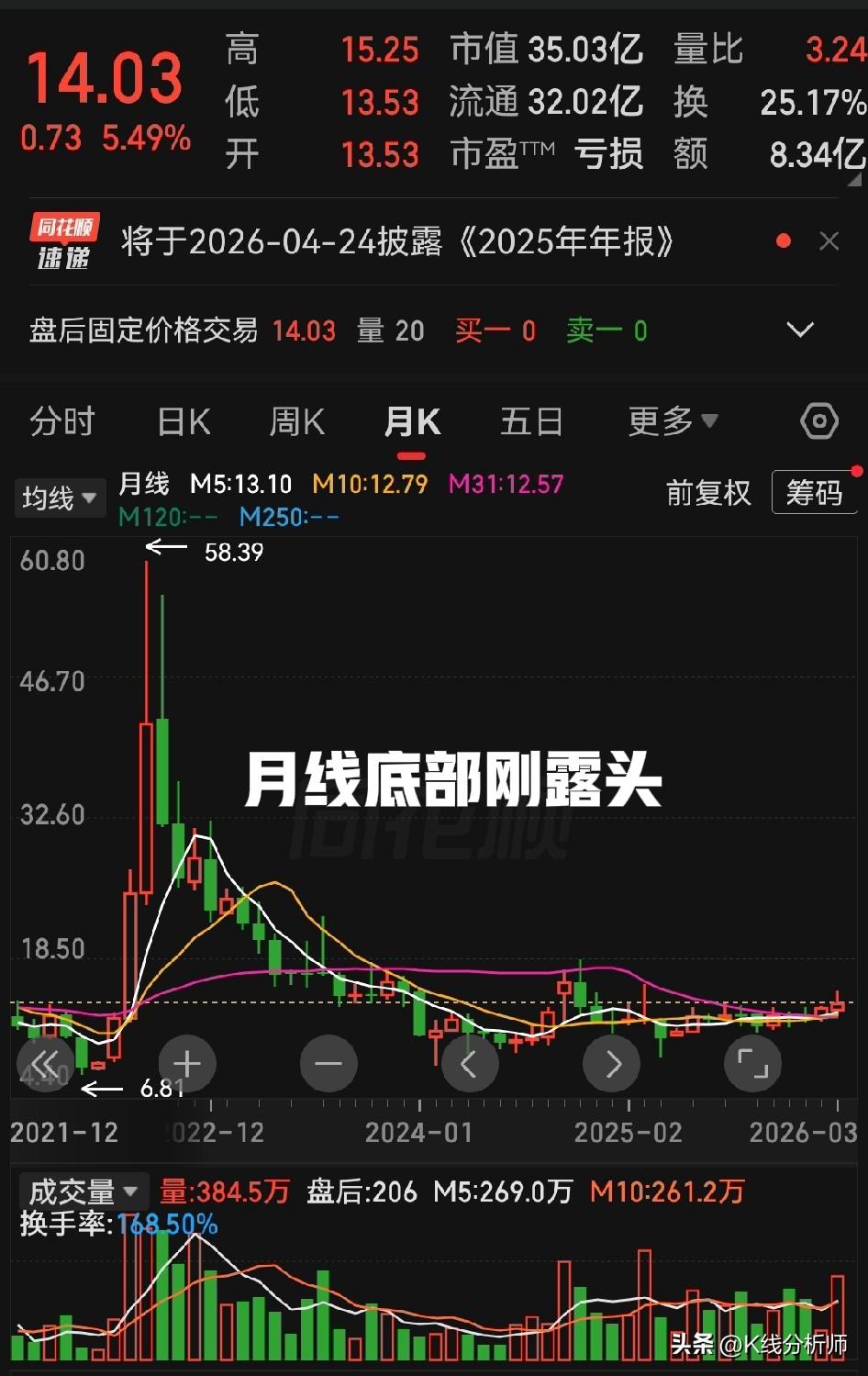 日线龙吸水后冲高回落,周线穿头破脚中阳线,月线底部刚露头。