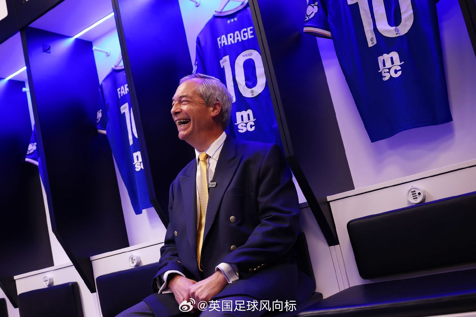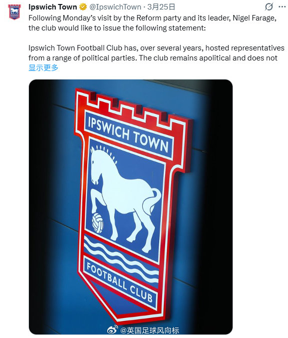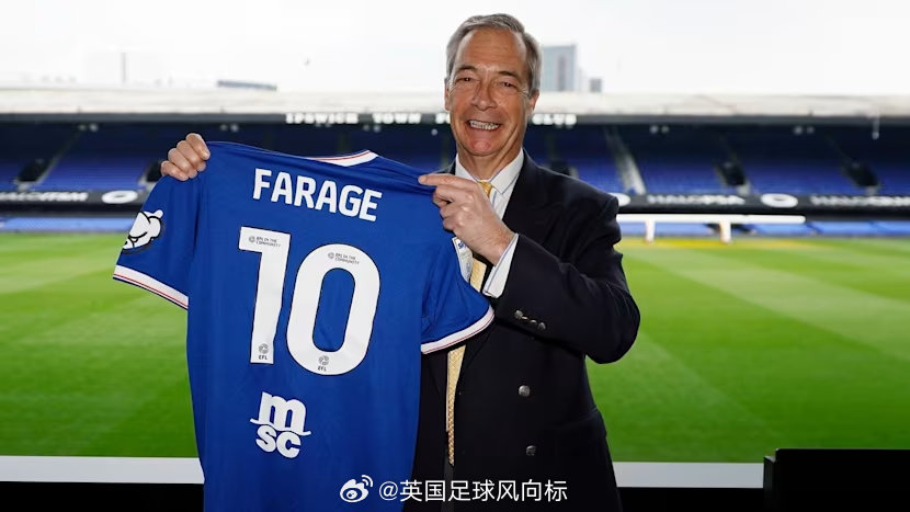 【英国特朗普】英国右翼政党,改革英国党的创办人兼党魁,奈杰尔-法拉奇,突然造访英冠球队伊普斯维奇的主场,波特曼路球场,高举该队球衣并且拍摄宣传短片,祝愿伊普斯维奇在本赛季剩余时间能够踢出精彩的表现。