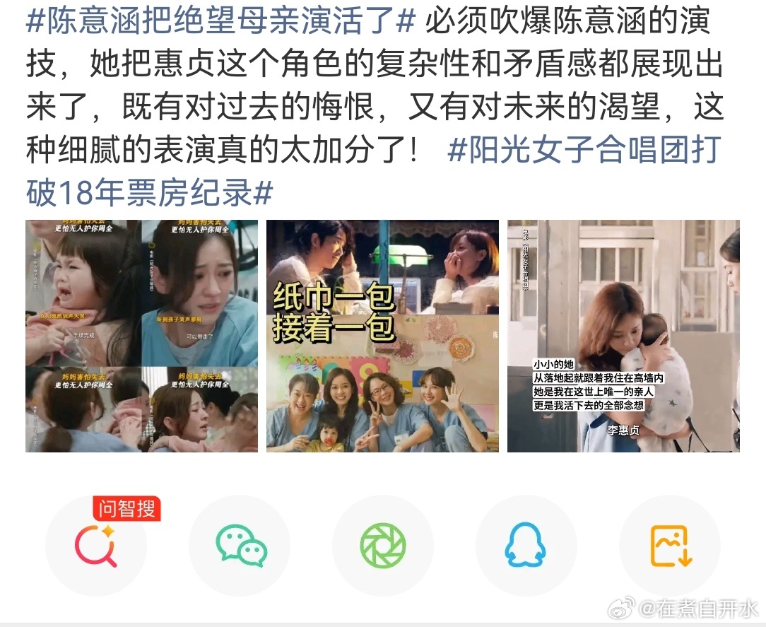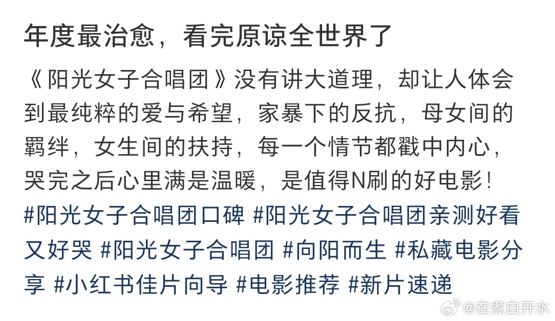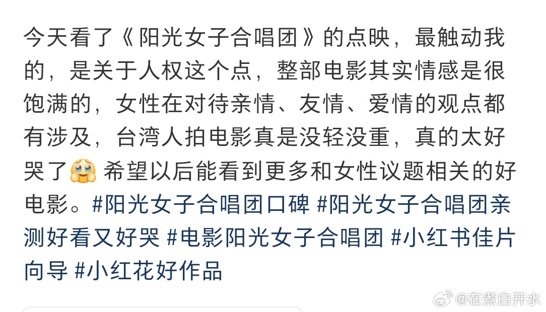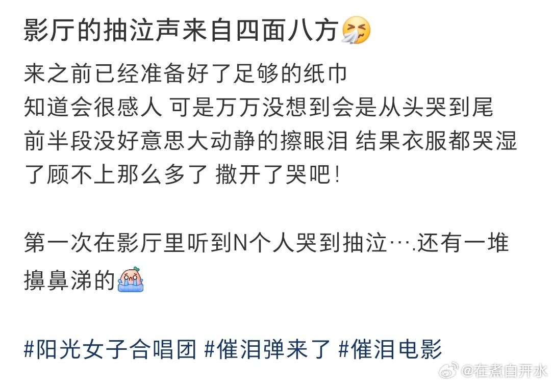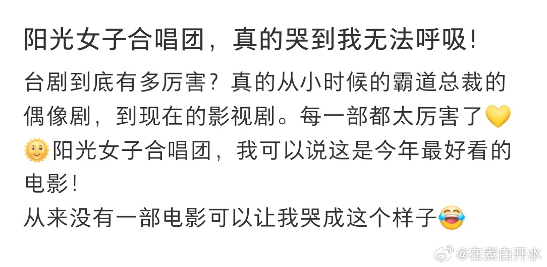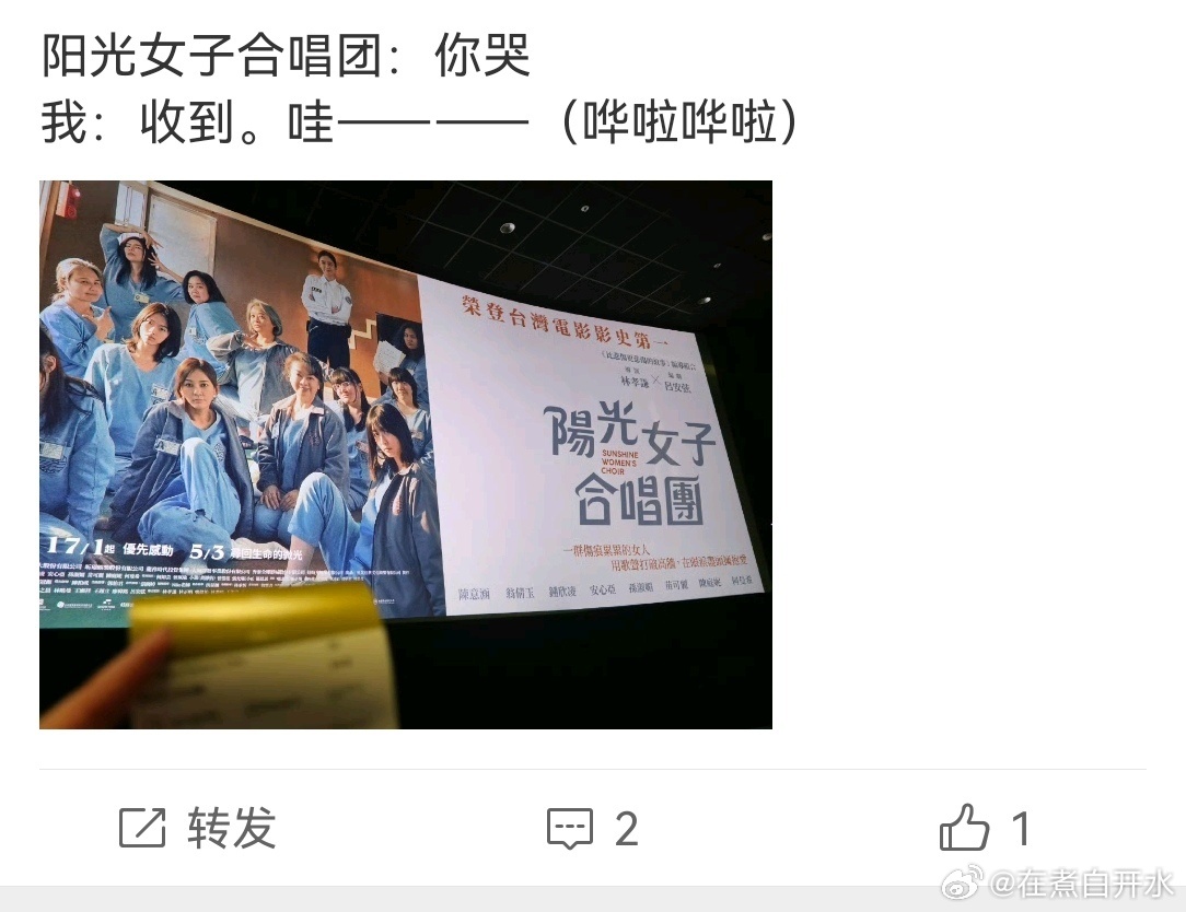 阳光女子合唱团点映口碑电影《阳光女子合唱团》首轮点映口碑超赞,陈意涵送走女儿的哭