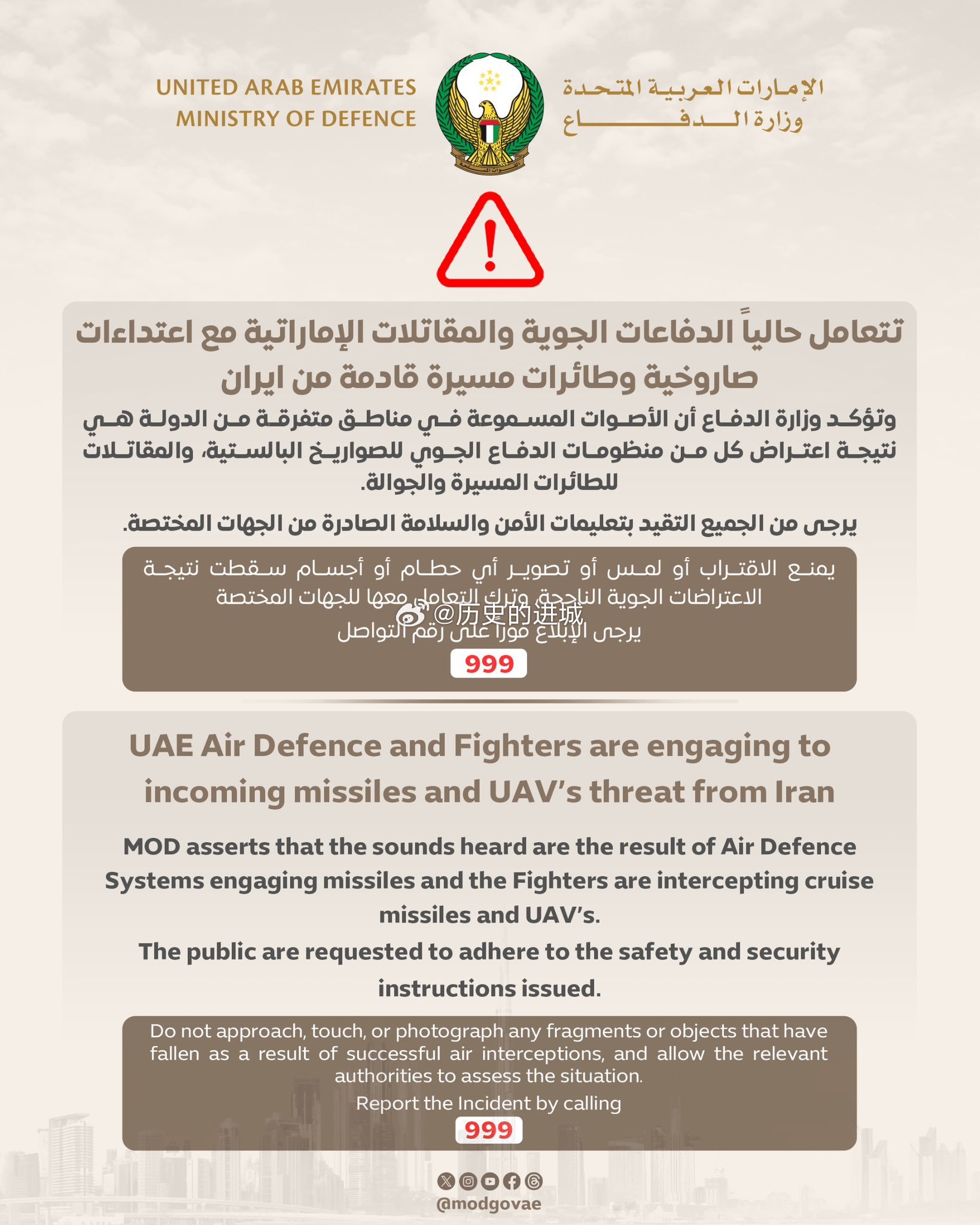 伊朗无人机群袭以色列最大运输中心阿联酋国防部在社交媒体发布通告称,阿联酋防空系统和战斗机正在拦截来自伊朗的来袭导弹和无人机威胁。阿联酋国防部声称,听到的声音是防空系统拦截导弹的结果,战斗机正在拦截巡航导弹和无人机。海外新鲜事
