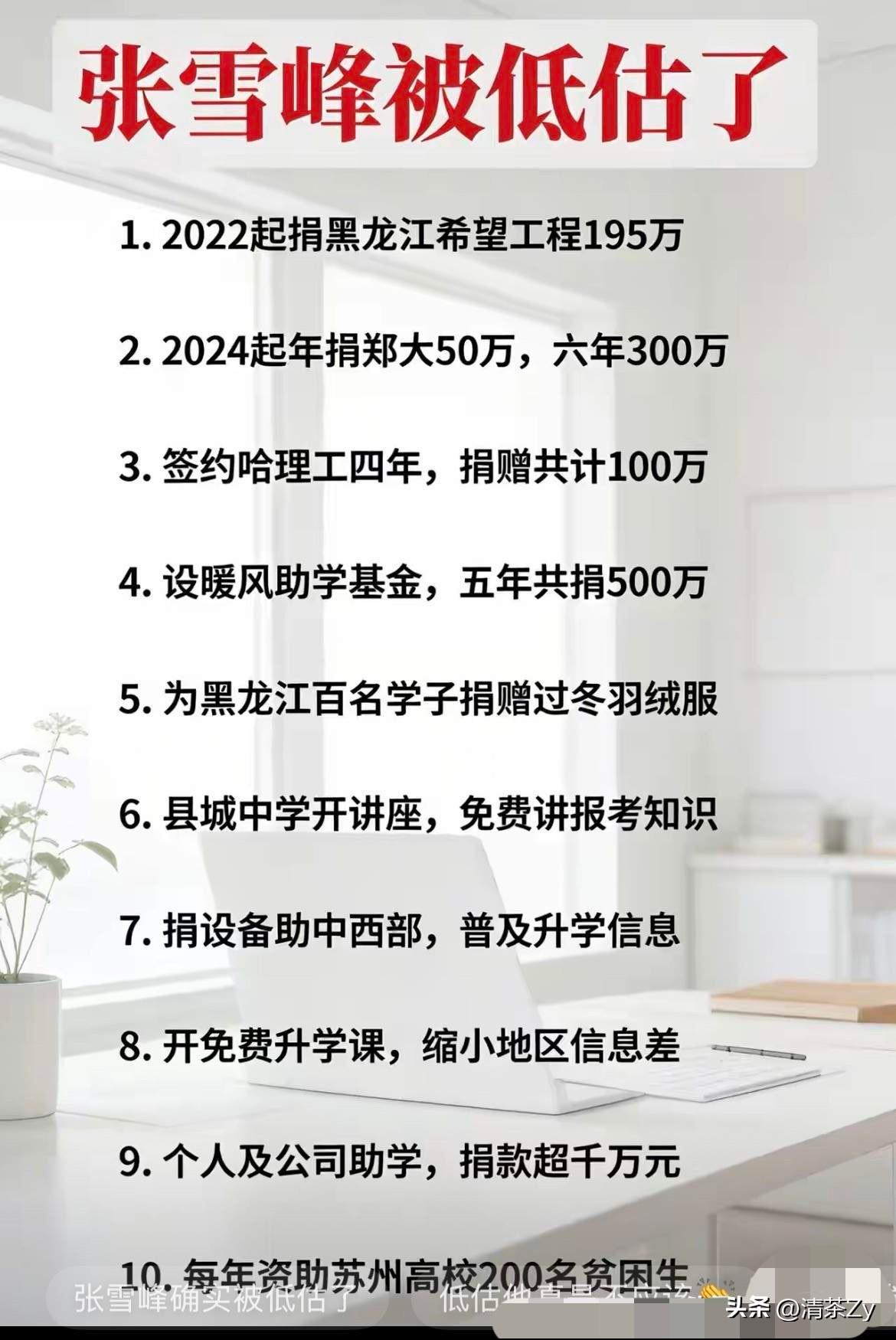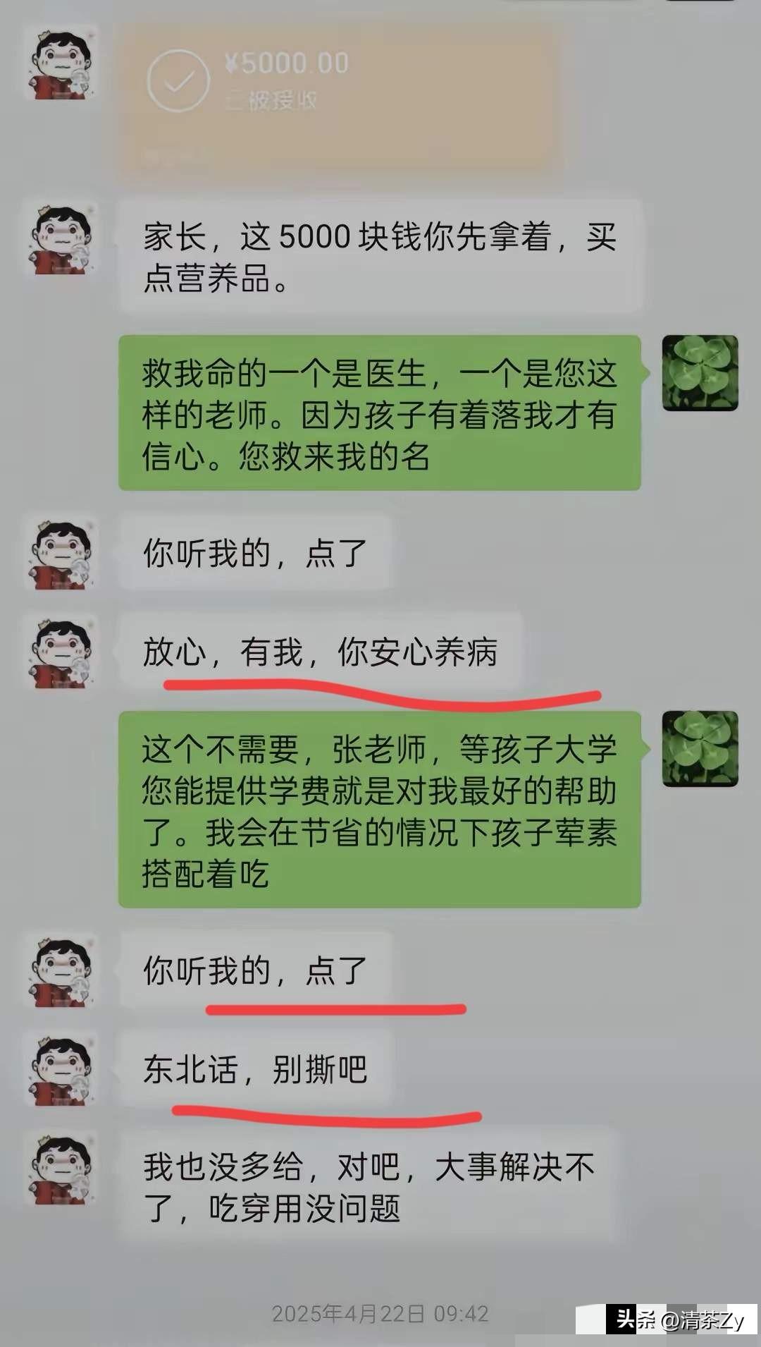 终于知道苏州街头为什么这么多人送别张雪峰老师了!他仗义,不光照顾公司员工,就连公司员工的家属也一起照顾,他不光给学生出谋划策,学生家长有事他也惦记着! 近日,河南的一位单亲妈妈晒出了她与张雪峰老师的聊天记录! 这位妈妈说孩子是高三学霸,成绩非常好!但是家里突遭变故,自己患上了重病,负债累累!妈妈为了给孩子报个稳当一点的志愿,花了几百块钱连麦张雪峰! 张雪峰知道情况后,当即就把连麦的费用退掉了,还承诺免费帮孩子指导填报志愿,孩子所有的大学费用他全部承担,孩子学到哪儿他供到哪! 随后,张雪峰加了孩子妈妈的微信,要家里的地址,准备把孩子学习的资料给寄过去!又给孩子妈妈转了5000块钱! 孩子妈妈说对自己帮助太大了,这钱不能要,可是张雪峰却说“别撕吧”!一个陌生的人就因为一次连麦,孩子的大学费用解决了,还经常给生病的孩子妈妈转钱买营养品! 一句“别撕吧”体现出了张雪峰老师热情豪爽,有担当重情意!就像他自己所说一样他永远成为了一代人的记忆!