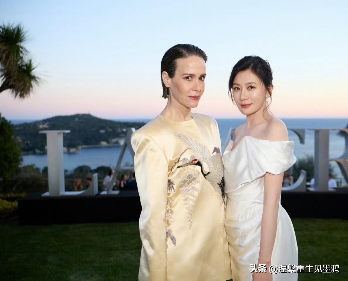 贾静雯身着一袭白色露肩礼裙,尽显温婉柔美;{香蕉姐}莎拉·保罗森则穿着带有仙鹤刺绣的米黄服饰,仙鹤在中国文化中常象征吉祥、长寿与高雅,搭配枝叶纹饰,将东方美学融入服饰,整体风格大气又具中式韵味。