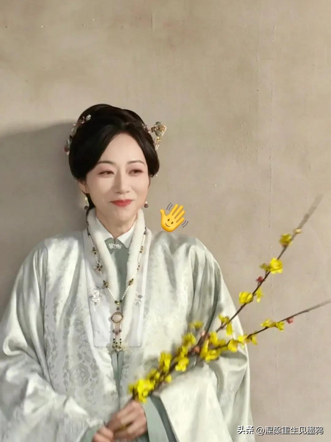 韩雪身着浅色古装,手持开着黄色花朵的花枝,面带微笑,流露出温婉甜美的气质。
