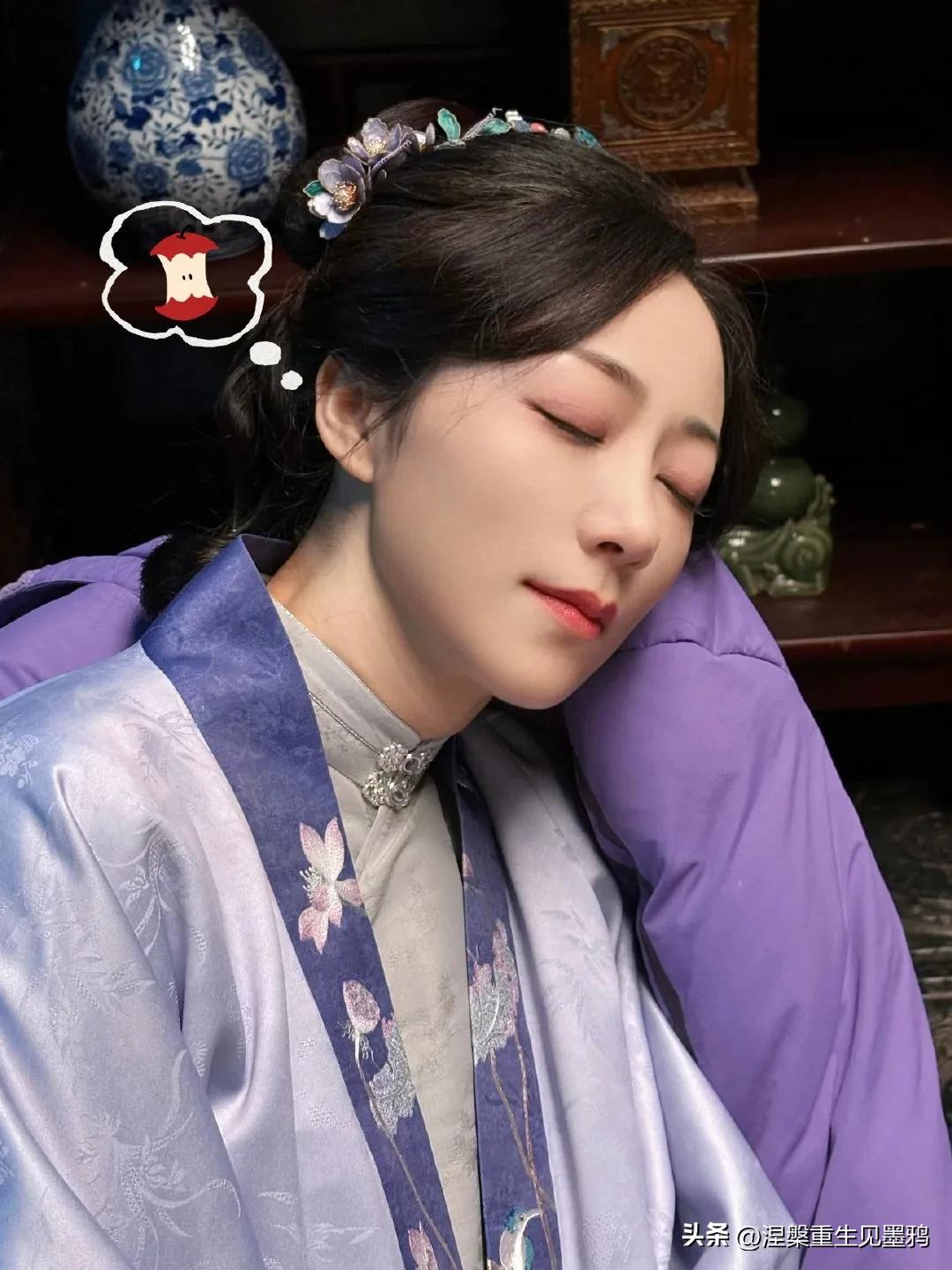 韩雪穿着紫色为主的古装,闭眼靠在紫色物件上,头上还有带有苹果图案的可爱贴纸,呈现出一种慵懒又可爱的神态,仿佛是片场休息时的温馨瞬间。