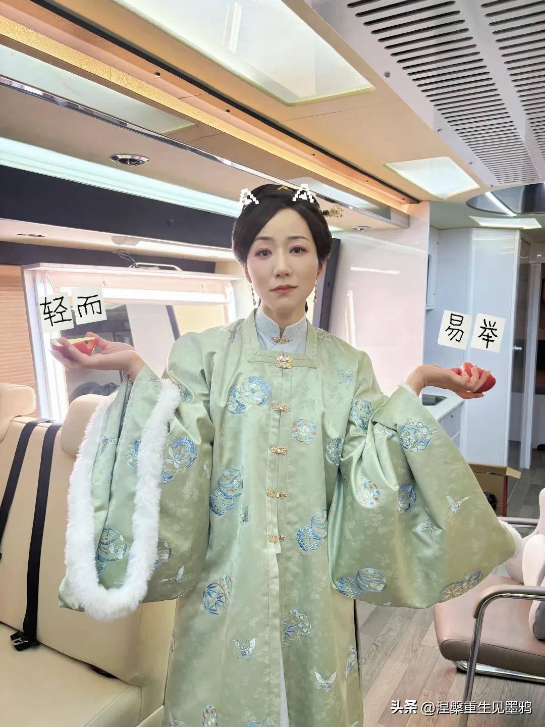 照片中,韩雪身着浅绿色带花纹的古装,衣袖有白色毛绒装饰,头戴兔耳朵发饰,双手分别拿着写有“轻而”“易举”的纸片,姿态俏皮,仿佛在轻松展示什么,背景像是车内或室内的场景,增添了生活感。