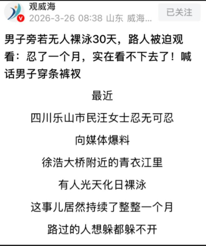 女子表示,她曝光男子的行为,不是为了针对谁,只是希望对方能意识到自己的问题,穿上泳裤文明游泳,给大家一个干净、舒适的公共环境,更不要让孩子受到不良影响。毕竟青衣江是公共水域,不是私人泳池,每个人都应该守住公共文明的底线。