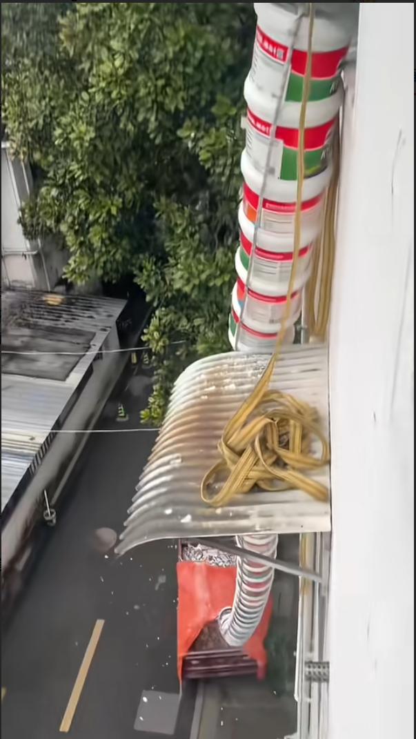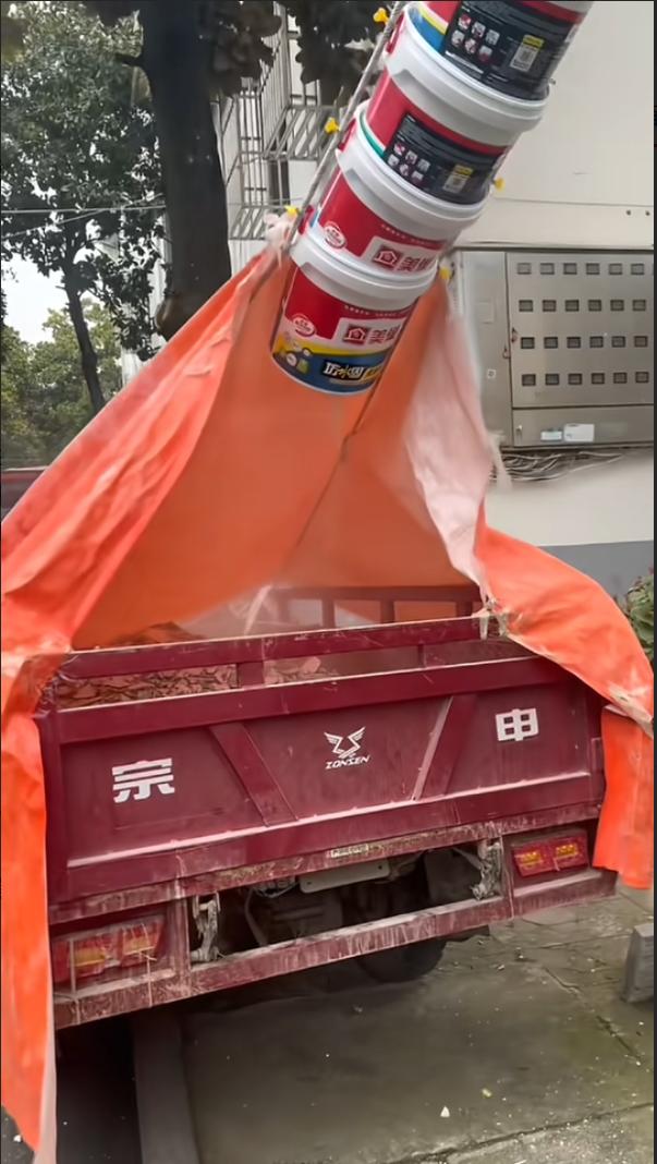 现在有了这个自制的“神器”,小伙一个人就能搞定,站在楼上往桶里倒垃圾,楼下只需要一个人负责整理,不到1小时,就能把两吨建筑垃圾全部运完,效率直接翻了9倍,还不用再扛着垃圾上下跑,大大减轻了劳动强度。