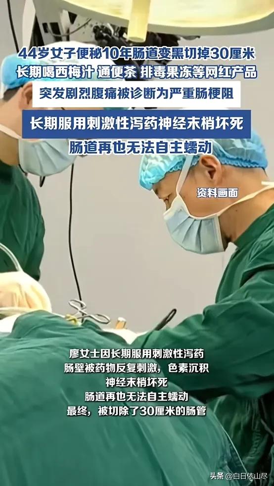 陕西西安,44岁的廖女士,十年间靠各类通便产品硬撑,最终肠子彻底“罢工”,不得不切除30厘米坏死肠管 。