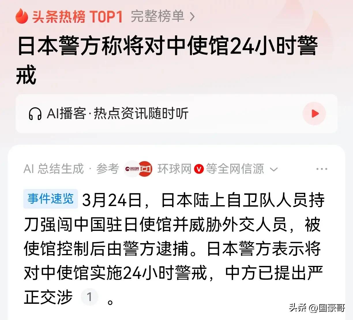 3月24日上午,23岁的日本陆上自卫队队员村田晃大,持刀翻墙闯入我驻日大使馆,并威胁要面见大使,扬言杀害外交人员,中方对此提出严正交涉与强烈抗议。 事发已经过去6天了,但日本方面仍然没有就此事正式向中方道歉,仅由内阁官房长官出面表示“遗憾”,日本主流媒体也都一致地“轻描淡写”。 很显然,自从高市早苗谬论事件以来,日本继续在“右转”的错误道路上狂奔,右翼势力以各种手段挑动民间对立、煽动反华情绪,并极力推动为日本军备扩张松绑,不仅向澳大利亚出售军舰,还妄图派军舰到霍尔木兹海峡护航,其勃勃野心早已昭然若揭。